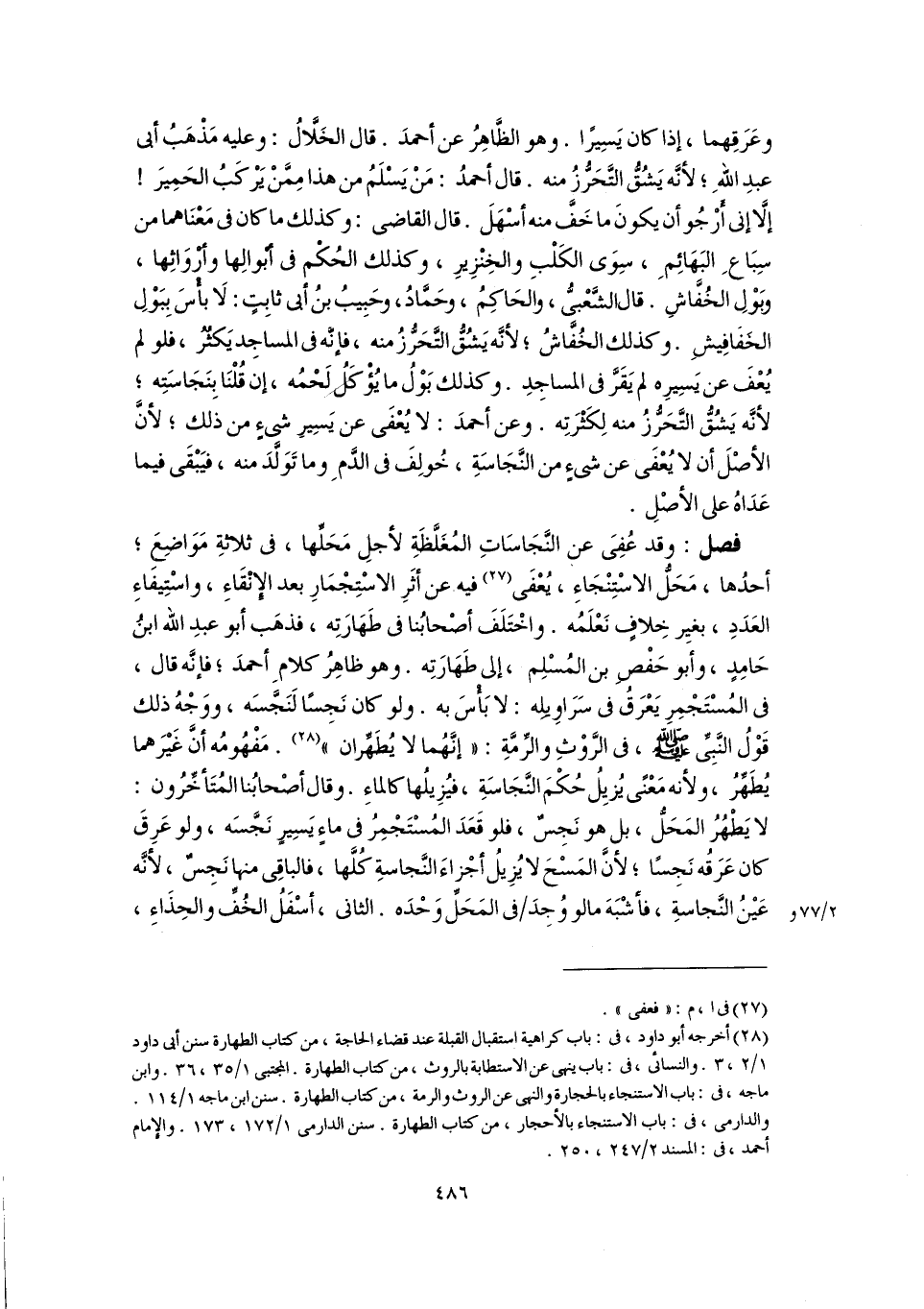 فصل: وقد عُفِىَ عن النَّجَاسَاتِ المُغَلَّظَةِ لأجلِ مَحَلِّها، في ثلاثةِ مَوَاضِعَ؛ أحدُها، مَحَلُّ الاسْتِنْجَاءِ، يُعْفَى (٢٧) فيه عن أثَرِ الاسْتِجْمَارِ بعد الإِنْقَاءِ، واسْتِيفَاءِ العَدَدِ، بغيرِ خِلافٍ نَعْلَمُه. واخْتَلَفَ أصْحابُنا في طَهَارَتِه، فذهَب أبو عبدِ اللَّه ابنُ حَامِدٍ، وأبو حَفْصِ بن المُسْلِم، إلى طَهَارَتِه. وهو ظاهِرُ كلامِ أحمدَ؛ فإنَّه قال، في المُسْتَجْمِرِ يَعْرَقُ في سَرَاوِيلِه: لا بَأْسَ به. ولو كان نَجِسًا لَنَجَّسَه، ووَجْهُ ذلك قَوْلُ النَّبِيِّ - صلى اللَّه عليه وسلم، في الرَّوْثِ والرِّمَّةِ: "إنَّهُما لا يُطَهِّران" (٢٨). مَفْهُومُه أنَّ غَيْرَهما يُطَهِّرُ، ولأنه مَعْنًى يُزِيلُ حُكْمَ النَّجَاسَةِ، فيُزِيلُها كالماءِ. وقال أصْحابُنا المُتَأخِّرُون: لا يُطَهِّرُ المَحَلُّ، بل هو نَجِسٌ، فلو قَعَدَ المُسْتَجْمِرُ في ماءٍ يَسِيرٍ نَجَّسَه، ولو عَرِقَ كان عَرَقُه نَجِسًا؛ لأنَّ المَسْحَ لا يُزِيلُ أجْزاءَ النَّجاسةِ كُلَّها، فالباقِى منها نَجِسٌ، لأنَّه عَيْنُ النَّجاسةِ، فأشْبَهَ ما لو وُجِدَ في المَحَلِّ وَحْدَه. الثاني، أسْفَلُ الخُفِّ والحِذَاءِ،