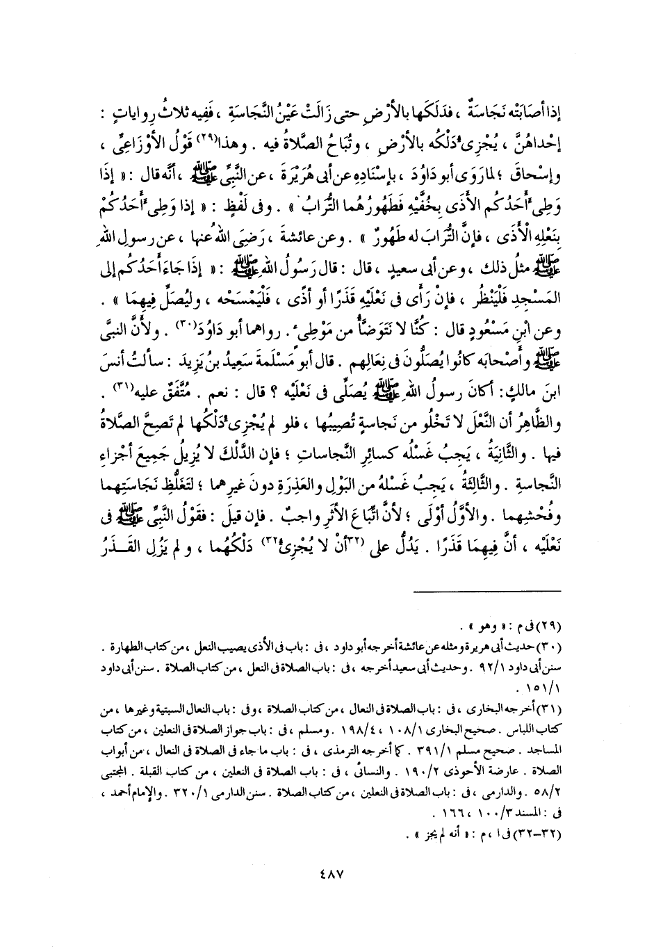 (٣٠) حديث أبي هريرة ومثله عن عائشة أخرجه أبو داود، في: باب في الأذى يصيب النعل، من كتاب الطهارة. سنن أبي داود ١/ ٩٢. وحديث أبي سعيد أخرجه، في: باب الصلاة في النعل، من كتاب الصلاة. سنن أبي داود ١/ ١٥١.