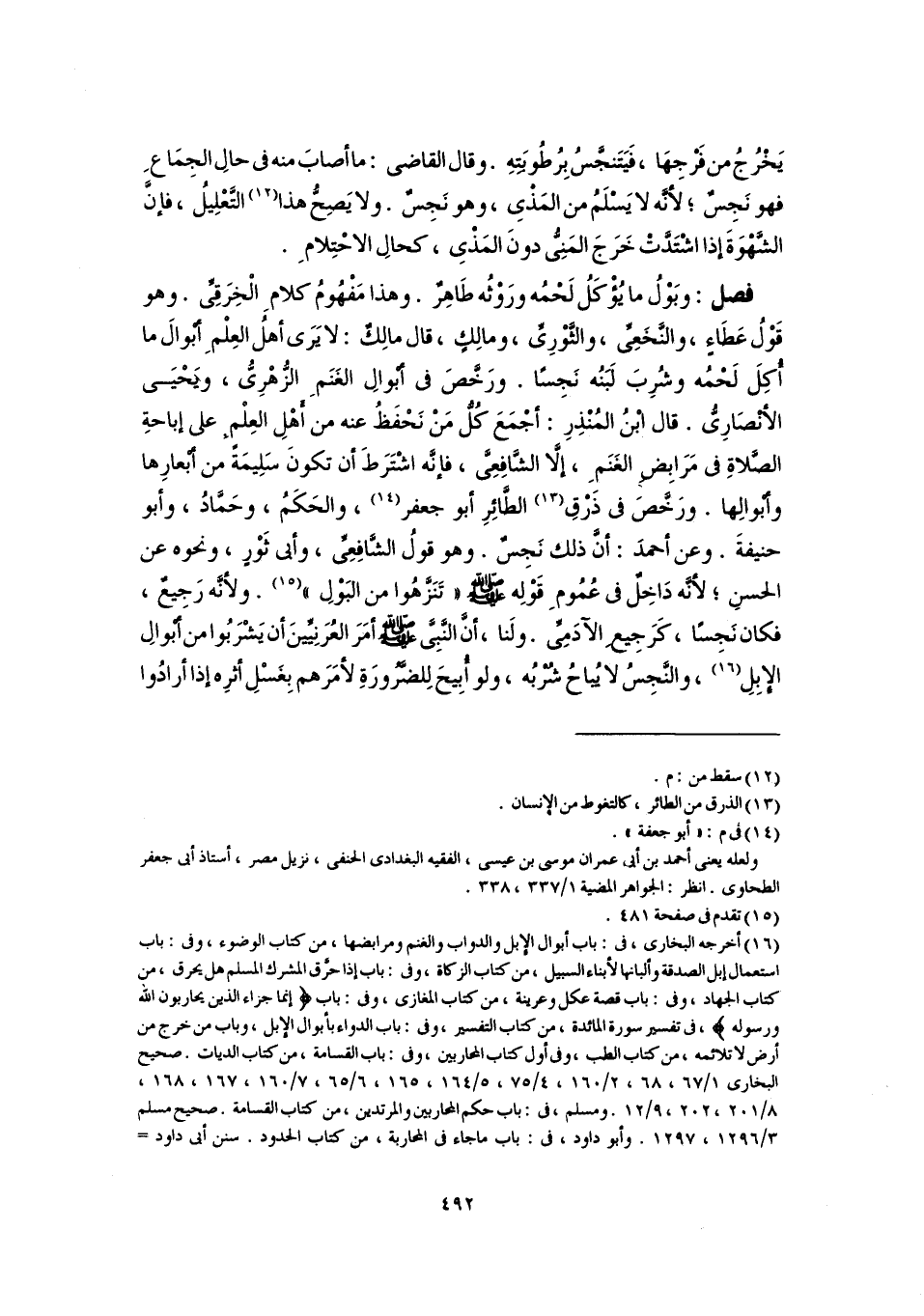 فصل: وبَوْلُ ما يُؤْكَلُ لَحْمُه ورَوْثُه طَاهِرٌ. وهذا مَفْهُومُ كلامِ الْخِرَقِىِّ. وهو قَوْلُ عَطَاءٍ، والنَّخَعِىٍّ، والثَّوْرِىِّ، ومالِكٍ، قال مالِكٌ: لا يَرَى أهلُ العِلْمِ أبْوالَ ما أُكِلَ لَحْمُه وشُرِبَ لَبَنُه نَجِسًا. ورَخَّصَ في أبْوالِ الغَنَمِ الزُّهْرِىُّ، ويَحْيَى الأنْصَارِىُّ. قال ابْنُ المُنْذِرِ: أجْمَعَ كُلُّ مَنْ نَحْفَظُ عنه من أَهْلِ العِلْمِ على إباحةِ الصَّلاةِ في مَرَابِضِ الغَنَمِ، إلَّا الشَّافِعِىَّ، فإنَّه اشْتَرَطَ أن تكونَ سَلِيمَةً من أبْعارِها وأبْوالِها. ورَخَّصَ في ذَرْقِ (١٣) الطَّائِرِ أبو جعفر (١٤)، والحَكَمُ، وحَمَّادُ، وأبو حنيفةَ. وعن أحمدَ: أنَّ ذلك نَجِسٌ. وهو قولُ الشَّافِعِىِّ، وأبي ثَوْرٍ، ونحوه عن الحسنِ؛ لأنَّه دَاخِلٌ في عُمُومِ قَوْلِه -صلى اللَّه عليه وسلم- "تَنَزَّهُوا من البَوْلِ" (١٥). ولأنَّه رَجِيعٌ، فكان نَجِسًا، كَرَجِيعِ الآدَمِىِّ. ولَنا، أنَّ النَّبِىَّ -صلى اللَّه عليه وسلم- أمَرَ العُرَنِيِّينَ أن يَشْرَبُوا من أبْوالِ الإبِلِ (١٦)، والنَّجِسُ لا يُباحُ شُرْبُه، ولو أُبِيحَ لِلضَّرُورَةِ لأمَرَهم بِغَسْلِ أثرِه إذا أرادُوا
