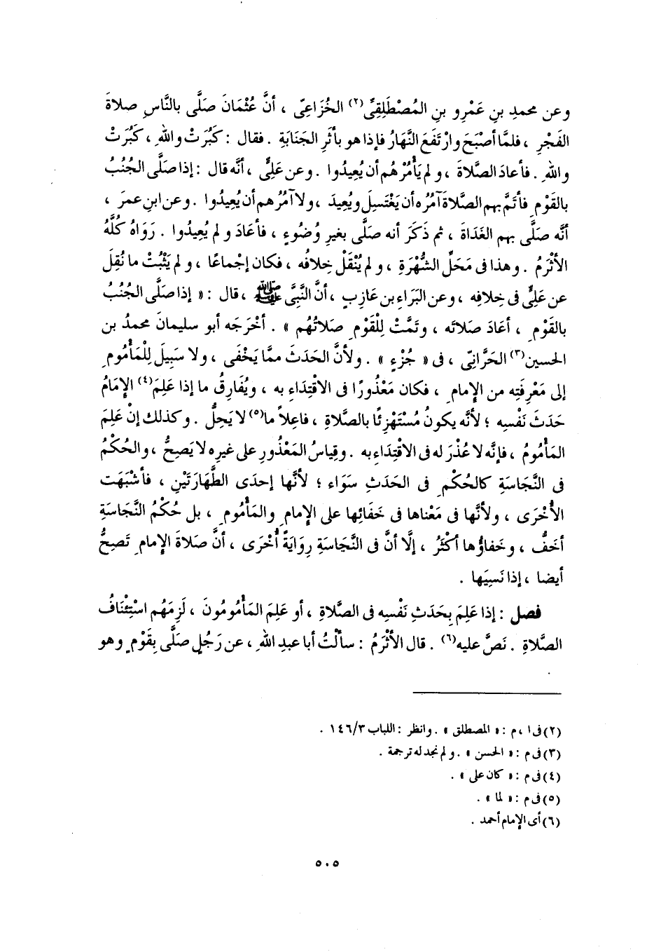 فصل: إذا عَلِمَ بِحَدَثِ نَفْسِه في الصَّلاةِ، أو عَلِمَ المَأْمُومُونَ، لَزِمَهُم اسْتِئْنَافُ الصَّلاةِ. نَصَّ عليه (٦). قال الأَثْرَمُ: سألْتُ أبا عبدِ اللهِ، عن رَجُلٍ صَلَّى بِقَوْمٍ وهو