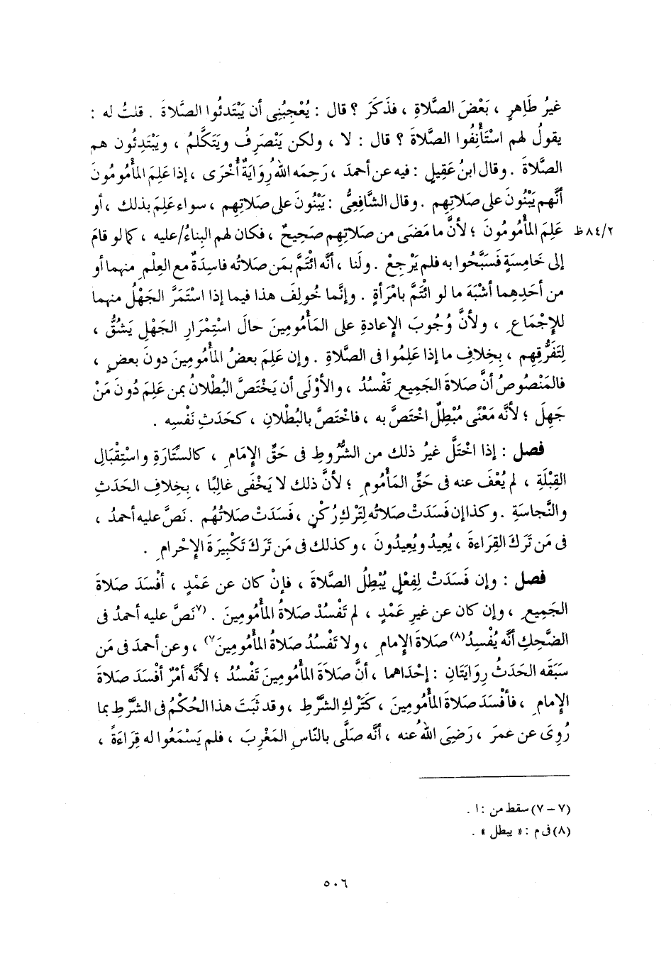 غيرُ طَاِهرٍ، بَعْضَ الصَّلاةِ، فذَكَرَ؟ قال: يُعْجِبُنِى أن يَبْتَدئُوا الصَّلاةَ. قلتُ له: يقولُ لهم اسْتَأْنِفُوا الصَّلاةَ؟ قال: لا، ولكن يَنْصَرِفُ ويَتَكَّلمُ، ويَبْتَدِئُون هم الصَّلاةَ. وقال ابنُ عَقِيلٍ: فيه عن أحمدَ، رَحِمَه اللهُ رُوَايَةٌ أُخْرَى، إذا عَلِمَ المأْمُومُونَ أنَّهم يَبْنُونَ على صَلاتِهِم. وقال الشَّافِعِىُّ: يَبْنُون على صَلاتِهِم، سواء عَلِمَ بذلك، أو عَلِمَ المأْمُومُونَ؛ لأنَّ ما مَضَى من صَلاتِهِم صَحِيحٌ، فكان لهم البِناءُ عليه، كما لو قامَ إلى خَامِسَةٍ فَسَبَّحُوا به فلم يَرْجِعْ. ولَنا، أَنَّه ائْتَمَّ بمَن صَلاتُه فاسِدَةٌ مع العِلْمِ منهما أو من أحَدِهِما أشْبَهَ ما لو ائْتَمَّ بامْرَأةٍ. وإنَّما خُولِفَ هذا فيما إذا اسْتَمَرَّ الجَهْلُ منهما للإِجْمَاعِ، ولأنَّ وُجُوبَ الإِعادةِ على المَأْمُومِينَ حالَ اسْتِمْرَارِ الجَهْلِ يَشُقُّ، لِتَفَرُّقِهِم، بِخِلافِ ما إذا عَلِمُوا في الصَّلاةِ. وإن عَلِمَ بعضُ المأْمُومِينَ دونَ بعضٍ، فالمَنْصُوصُ أنَّ صَلاةَ الجَمِيعِ تَفْسُدُ، والأوْلَى أن يَخْتَصَّ البُطْلانُ بمن عَلِمَ دُونَ مَنْ جَهِلَ؛ لأنَّه مَعْنًى مُبْطِلٌ اخْتَصَّ به، فاخْتَصَّ بالبُطْلانِ، كحَدَثِ نَفْسِه.