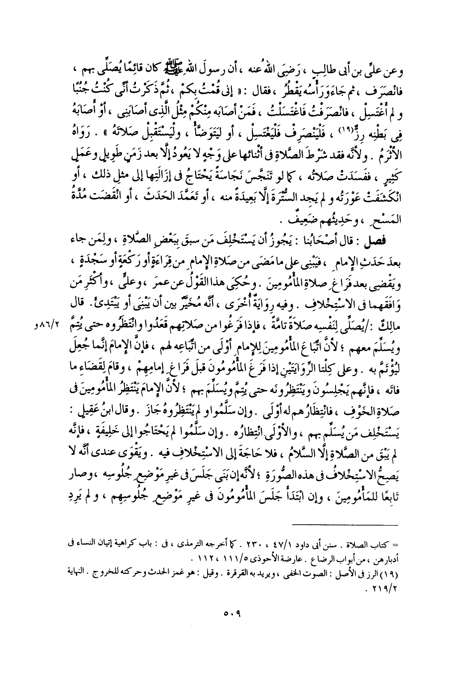 وعن عليِّ بن أبي طالِبٍ، رَضِىَ اللهُ عنه، أن رسولَ اللهِ -صلى اللَّه عليه وسلم- كان قائِمًا يُصَلِّى بهم، فانصَرَف، ثم جَاءَ وَرَأْسُه يَقْطُرُ، فقال: "إني قُمْتُ بِكمْ، ثُمَّ ذَكَرْتُ أنِّي كُنْتُ جُنُبًا ولم أَغْتَسِلْ، فانْصَرَفْتُ فَاغْتَسَلْتُ، فَمَنْ أصَابَه مِنْكُمْ مِثْلُ الَّذِى أصَابَنِى، أوْ أَصَابَهُ فِي بَطْنِه رِزٌّ (١٩)، فَلْيَنْصَرِفْ فَلْيَغْتَسِلْ، أو ليَتَوَضَّأْ، ولْيَسْتَقْبِلْ صَلاتَهُ". رَوَاهُ الأثْرَمُ. ولأنَّه فقد شَرْطَ الصَّلاةِ في أثْنائها على وَجْهٍ لا يَعُودُ إِلَّا بعد زَمَنٍ طَوِيلٍ وعَمَلٍ كَثِيرٍ، ففَسَدَتْ صَلاتُه، كما لو تَنَجَّسَ نَجَاسَةً يَحْتَاجُ في إزَالَتِها إلى مثلِ ذلك، أو انْكَشَفَتْ عَوْرَتُه ولم يَجِد السُّتْرَةَ إلَّا بَعِيدَةً منه، أو تَعَمَّدَ الحَدَثَ، أو انْقَضَت مُدَّةُ المَسْحِ، وحَدِيثُهم ضَعِيفٌ.