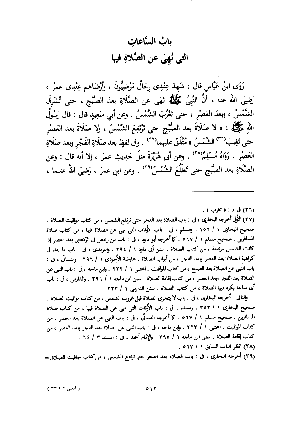 رَوَى ابنُ عَبَّاسٍ قال: شَهِدَ عِنْدِى رِجَالٌ مَرْضِيُّونَ، وأَرْضَاهم عِنْدِى عمرُ، رَضِىَ اللَّه عنه، أنَّ النَّبِيَّ -صلى اللَّه عليه وسلم- نَهَى عن الصَّلَاةِ بعدَ الصُّبْحِ، حتَّى تُشْرِقَ الشَّمْسُ، وبعدَ العَصْرِ، حتى تَغْرُبَ الشَّمْسُ. وعن أبِي سَعِيدٍ قال: قال رَسُولُ اللهِ -صلى اللَّه عليه وسلم-: "لا صَلَاةَ بعد الصُّبْحِ حتى تَرْتَفِعَ الشَّمْسُ، ولا صَلَاةَ بعد العَصْرِ حتى تَغِيبَ (٣٦) الشَّمْسُ" مُتَّفَقٌ عليهما (٣٧). وفى لفظٍ بعد صَلَاةِ الفَجْرِ وبعد صَلَاةِ العَصْرِ. رَوَاهُ مُسْلِمٌ (٣٨). وعن أبي هُرَيْرَةَ مثلُ حَدِيثِ عمرَ، إلا أنه قال: وعن الصَّلَاةِ بعد الصُّبْحِ حتَّى تَطْلُعَ الشَّمْسُ (٣٩). وعن ابنِ عمرَ، رَضِىَ اللهُ عنهما،