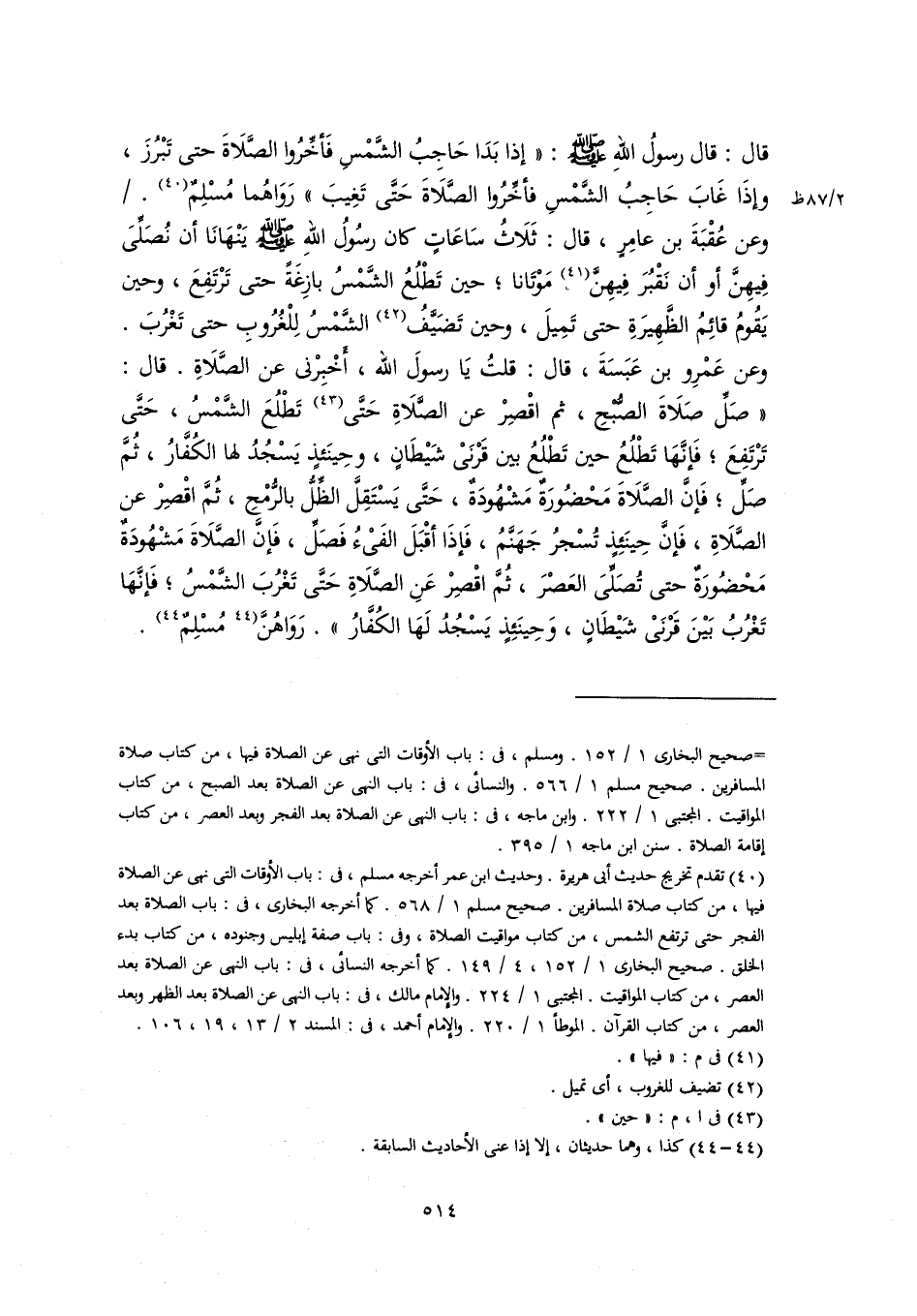 قال: قال رسولُ اللهِ -صلى اللَّه عليه وسلم-: "إِذا بَدَا حَاجِبُ الشَّمْسِ فَأخِّرُوا الصَّلَاةَ حتَّى تَبْرُزَ، وإذَا غَابَ حَاجِبُ الشَّمْسِ فأخِّرُوا الصَّلَاةَ حَتَّى تَغِيبَ" رَوَاهُما مُسْلِمٌ (٤٠). وعن عُقْبَةَ بن عامِرٍ، قال: ثَلَاثُ سَاعَاتٍ كان رسُولُ اللهِ -صلى اللَّه عليه وسلم- يَنْهَانَا أن نُصَلِّىَ فِيهِنَّ أو أن نَقْبُرَ فِيهِنَّ (٤١) مَوْتَانا؛ حين تَطْلُعُ الشَّمْسُ بازِغَةً حتَّى تَرْتَفِعَ، وحين يَقُومُ قائِمُ الظَّهِيرَةِ حتَّى تَمِيلَ، وحين تَضَيَّفُ (٤٢) الشَّمْسُ لِلْغُرُوبِ حتَّى تَغْرُبَ. وعن عَمْرِو بن عَبَسَةَ، قال: قلتُ يَا رسولَ اللَّه، أَخْبِرْنى عن الصَّلَاةِ. قال: "صَلِّ صَلَاةَ الصُّبْحِ، ثم اقْصِرْ عن الصَّلَاةِ حَتَّى (٤٣) تَطْلُعَ الشَّمْسُ، حَتَّى تَرْتَفِعَ؛ فَإنَّهَا تَطْلُعُ حين تَطْلُعُ بين قَرْنَىْ شَيْطَانٍ، وحِينَئذٍ يَسْجُدُ لها الكُفَّارُ، ثُمَّ صَلِّ؛ فَإنَّ الصَّلَاةَ مَحْضُورَةٌ مَشْهُودَةٌ، حَتَّى يَسْتَقِلَّ الظِّلُّ بالرُّمْحِ، ثُمَّ اقْصِرْ عن الصَّلَاةِ، فَإنَّ حِينَئِذٍ تُسْجرُ جَهَنَّمُ، فَإذَا أقْبَلَ الفَىْءُ فَصَلِّ، فَإنَّ الصَّلَاةَ مَشْهُودَةٌ مَحْضُورَةٌ حتى تُصَلِّىَ العَصْرَ، ثُمَّ اقْصِرْ عَنِ الصَّلَاةِ حَتَّى تَغْرُبَ الشَّمْسُ؛ فَإنَّهَا تَغْرُبُ بَيْنَ قَرْنَىْ شَيْطَانٍ، وَحِينَئِذٍ يَسْجُدُ لَهَا الكُفَّارُ". رَوَاهُنَّ [مُسْلِمٌ] (٤٤).