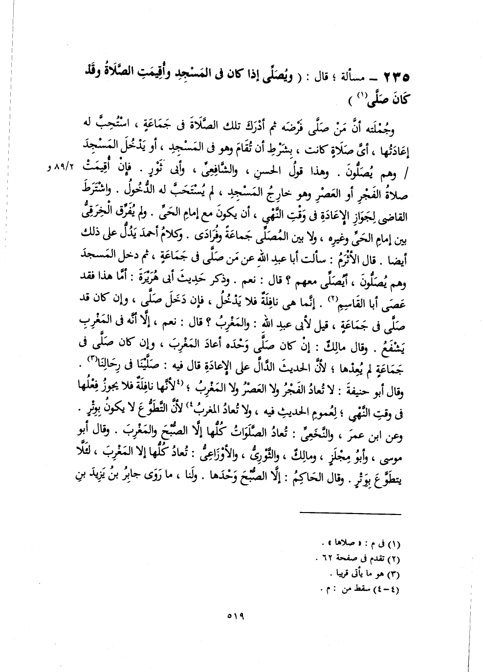 ٢٣٥ - مسألة؛ قال: (ويُصَلِّى إذا كان في المَسْجِدِ وأُقِيمَتِ الصَّلَاةُ وقَدْ كَانَ صَلَّى (١))