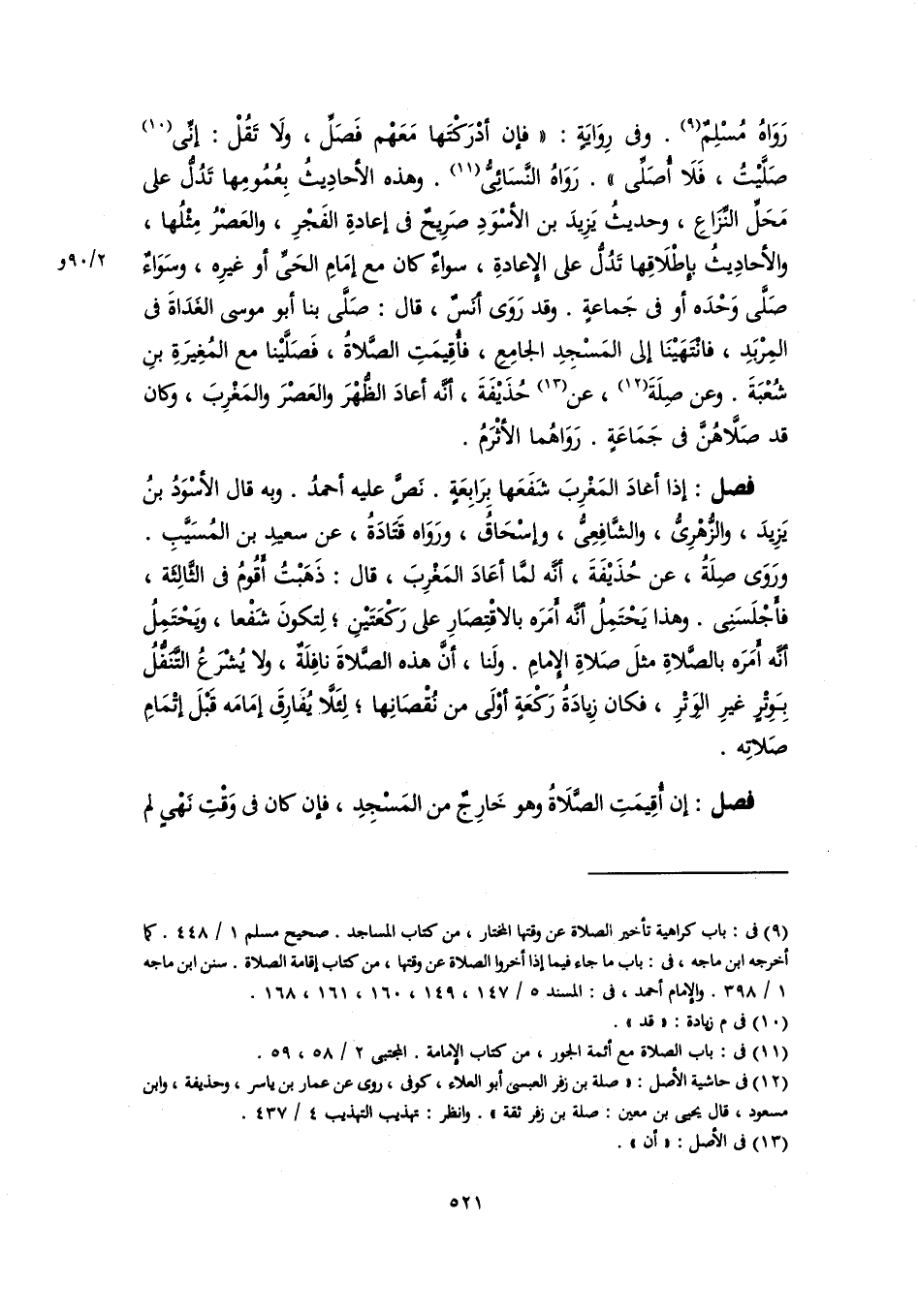 رَوَاهُ مُسْلِمٌ (٩). وفي رِوَايَةٍ: "فإن أدْرَكْتَها مَعَهْم فَصَلِّ، ولَا تَقُلْ: إنِّي (١٠) صَلَّيْتُ، فَلَا أُصَلِّى". رَوَاهُ النَّسَائِىُّ (١١). وهذه الأحادِيثُ بِعُمُومِها تَدُلُّ على مَحَلِّ النِّزَاعِ، وحديثُ يَزِيدَ بن الأسْوَدِ صَرِيحٌ في إعادةِ الفَجْرِ، والعَصْرُ مِثْلُها، والأحادِيثُ بإِطْلَاقِها تَدُلُّ على الإِعادةِ، سواءٌ كان مع إمَامِ الحَىِّ أو غيرِه، وسَوَاءٌ صَلَّى وَحْدَه أو في جَماعةٍ. وقد رَوَى أنَسٌ، قال: صَلَّى بنا أبو موسى الغدَاةَ في المِرْبَدِ، فانتهَيْنَا إلى المَسْجِدِ الجامِعِ، فأُقيمَتِ الصَّلاةُ، فَصَلَّيْنا مع المُغِيرَةِ بنِ شُعْبَةَ. وعن صِلَةَ (١٢)، عن (١٣) حُذَيْفَةَ، أنَّه أعادَ الظُّهْرَ والعَصْرَ والمَغْرِبَ، وكان قد صَلَّاهُنَّ في جَمَاعَةٍ. رَوَاهُما الأثْرَمُ.