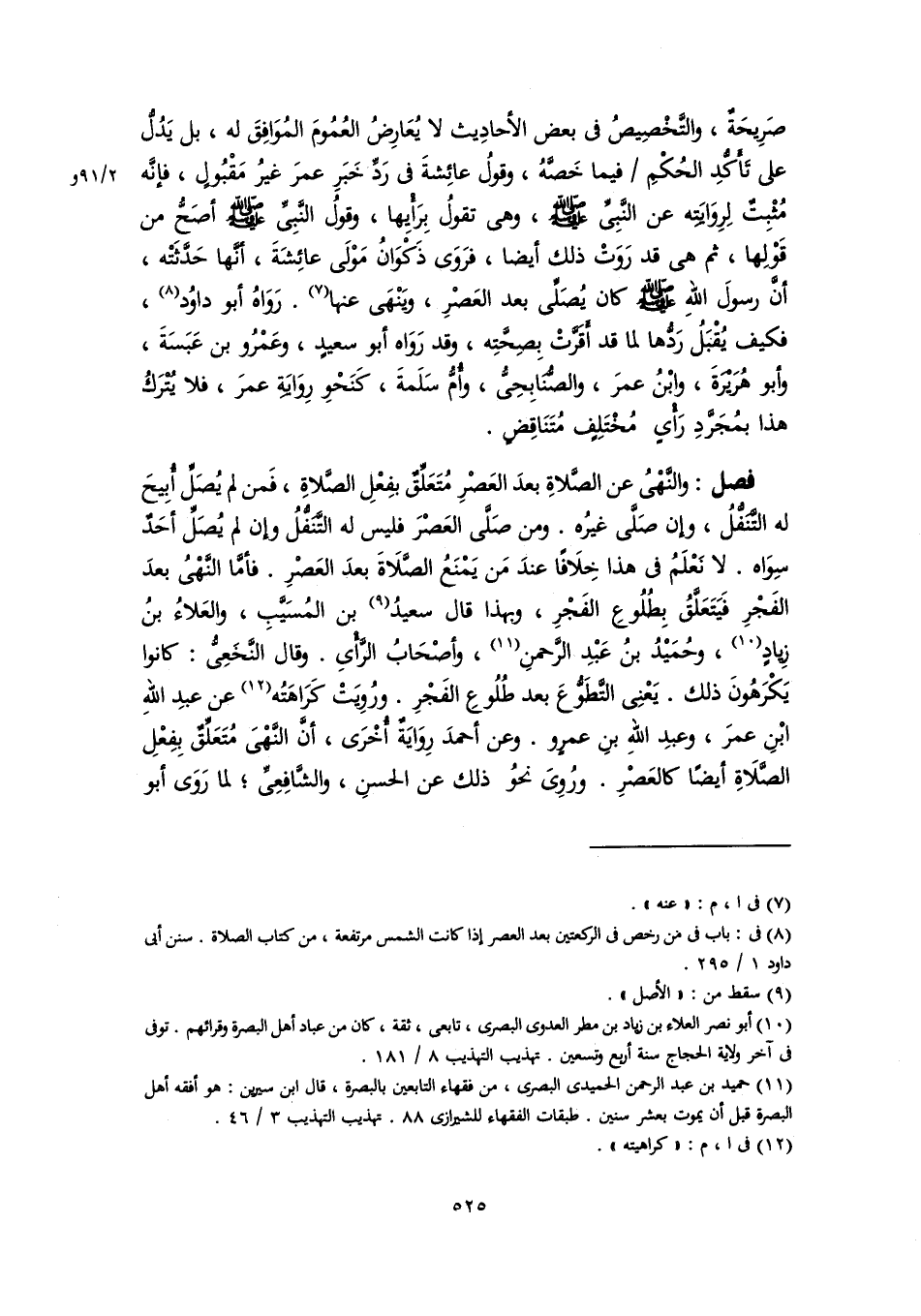 صَرِيحَةٌ، والتَّخْصِيصُ في بعض الأحادِيث لا يُعَارِضُ العُمُومَ المُوَافِقَ له، بل يَدُلُّ على تَأَكُّدِ الحُكْمِ فيما خَصَّهُ، وقولُ عائِشةَ في رَدِّ خَبَرِ عمرَ غيرُ مَقْبُولٍ، فإنَّه مُثْبِتٌ لِرِوَايَتِه عن النَّبِيِّ -صلى اللَّه عليه وسلم-، وهى تقولُ بِرَأْيِها، وقولُ النَّبِىِّ -صلى اللَّه عليه وسلم- أصَحُّ من قَوْلِها، ثم هي قد رَوَتْ ذلك أيضًا، فرَوَى ذَكْوَانُ مَوْلَى عائِشَةَ، أنَّها حَدَّثَتْه، أنَّ رسولَ اللهِ -صلى اللَّه عليه وسلم- كان يُصَلِّى بعد العَصْرِ، ويَنْهَى عنها (٧). رَوَاهُ أبو داوُد (٨)، فكيف يُقْبَلُ رَدُّها لما قد أَقَرَّتْ بصِحَّتِه، وقد رَوَاه أبو سعيدٍ، وعَمْرُو بن عَبَسَةَ، وأبو هُرَيْرَةَ، وابْنُ عمرَ، والصُّنَابِحِىُّ، وأُمُّ سَلَمةَ، كَنَحْوِ رِوَايَةِ عمرَ، فلا يُتْرَكُ هذا بمُجَرَّدِ رَأْيٍ مُخْتَلِفٍ مُتَنَاقِضٍ.