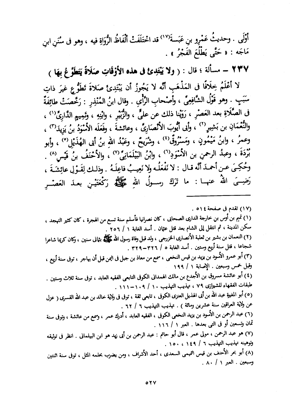 لا أعْلَمُ خِلَافًا في المَذْهَبِ أنَّه لا يَجُوزُ أن يَبْتَدِئَ صَلاةَ تَطَوُّعٍ غيرَ ذاتِ سَبَبٍ. وهو قَولُ الشَّافِعِىِّ، وأصْحابِ الرَّأْىِ. وقال ابنُ المُنْذِرِ: رَخَّصَتْ طائِفَةٌ في الصَّلَاةِ بعد العَصْرِ، رَوَيْنا ذلك عن علىٍّ، والزُّبَيْرِ، وابْنِهِ، وتَمِيمٍ الدَّارِىِّ (١)، والنُّعْمَانِ بن بَشِيرٍ (٢)، وأبى أيُّوبَ الأنْصَارِىِّ، وعائشةَ، وفَعَلَه الأسْوَدُ بنُ يَزِيدَ (٣)، وعمرُ، وابنُ مَيْمُونٍ، ومَسْرُوقٌ (٤)، وشُرَيحٌ، وعَبْدُ اللهِ بنُ أبى الهُذَيْلِ (٥)، وأبو بُرْدَةَ، وعبدُ الرحمنِ بن الأسْوَدِ (٦)، وابْنُ البَيْلَمَانِىِّ (٧)، والأحْنَفُ بنُ قَيْسٍ (٨). وحُكِىَ عن أحمدَ أنَّه قال: لا نَفْعَلُه ولا نَعِيبُ فاعِلَهُ. وذلك لِقَوْلِ عائِشَةَ، رضىَ اللهُ عنها: ما تَرَكَ رسولُ اللهِ -صلى اللَّه عليه وسلم- رَكْعَتَيْنِ بعدَ العَصْرِ