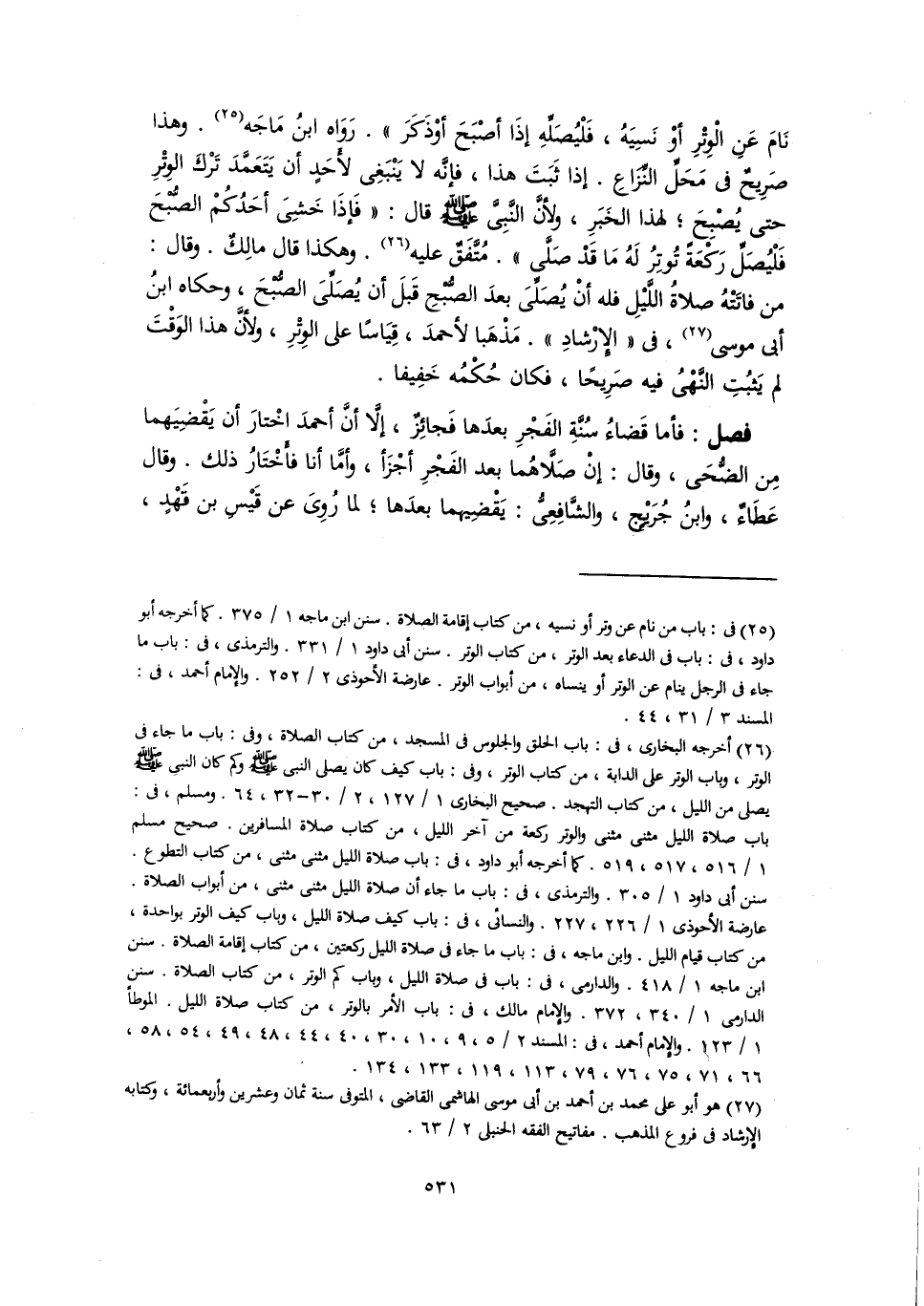 نَامَ عَنِ الْوِتْرِ أوْ نَسِيَهُ، فَلْيُصَلِّهِ إذَا أصْبَحَ أوْ ذَكَرَ". رَوَاه ابنُ مَاجَه (٢٥). وهذا صَرِيحٌ فى مَحَلِّ النِّزَاعِ. إذا ثَبَتَ هذا، فإنَّه لا يَنْبَغِى لأَحَدٍ أن يَتَعَمَّدَ تَرْكَ الوِتْرِ حتى يُصْبِحَ؛ لهذا الخَبَرِ، ولأنَّ النَّبِيَّ -صلى اللَّه عليه وسلم- قال: "فَإذَا خَشِىَ أحَدُكُمْ الصُّبْحَ فَلْيُصَلِّ رَكْعَةً تُوتِرُ لَهُ مَا قَدْ صَلَّى". مُتَّفَقٌ عليه (٢٦). وهكذا قال مالِكٌ. وقال: من فاتَتْهُ صلاةُ اللَّيْلِ فله أنْ يُصَلِّىَ بعدَ الصُّبْحِ قَبلَ أن يُصَلِّىَ الصُّبْحَ، وحكاه ابنُ أبى موسى (٢٧)، في "الإِرْشادِ". مَذْهَبا لأحمدَ، قِيَاسًا على الوِتْرِ، ولأنَّ هذا الوَقْتَ لم يَثبُتِ النَّهْىُ فيه صَرِيحًا، فكان حُكمُه خَفِيفا.