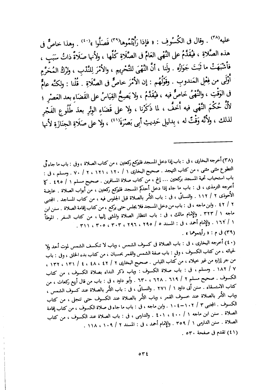 عليه (٣٨). وقال في الكُسُوفِ: "فإذا رَأَيْتُمُوها (٣٩) فَصَلُّوا" (٤٠). وهذا خاصٌّ في هذه الصَّلاةِ، فيُقَدَّمُ على النَّهْىِ العَامِّ في الصَّلَاةِ كُلِّها، ولأنها صَلَاةٌ ذاتُ سَبَبٍ، فأشْبَهَتْ ما ثَبَتَ جَوَازُه. ولَنا، أنَّ النَّهْىَ للتَّحْرِيمِ، والأمْرَ لِلنَّدْبِ، وتَرْكُ المُحَرَّمِ أَوْلَى من فِعْلِ المَندوبِ. وقَوْلُهُم: إن الأمْرَ خاصٌّ في الصَّلَاةِ. قُلْنا: ولكنَّه عامٌّ في الوَقْتِ، والنَّهْىُ خَاصٌّ فيه، فيُقَدَّمُ، ولا يَصِحُّ القِيَاسُ على القَضَاءِ بعد العَصْرِ؛ لأنَّ حُكْمَ النَّهْىِ فيه أخَفُّ، لما ذَكَرْنا، ولا على قَضَاءِ الوِتْرِ بعدَ طُلُوعِ الفَجْرِ لذلك، ولأنَّه وَقْتٌ له، بِدليلِ حَدِيثِ أبِى بَصْرَةَ (٤١)، ولا على صَلَاةِ الجِنَازَةِ لأنها