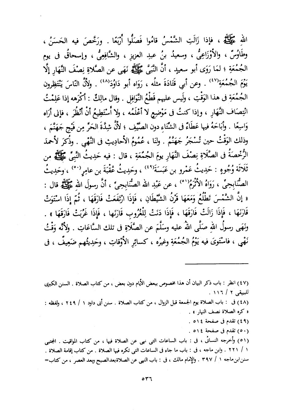 اللهِ -صلى اللَّه عليه وسلم-، فإذا زَالَتِ الشَّمْسُ قامُوا فَصَلُّوا أَرْبَعًا. ورَخَّصَ فيه الحَسَنُ، وطَاوُسٌ، والأوْزَاعِىُّ، وسعيدُ بنُ عبدِ العزيزِ، والشَّافِعِىُّ، وإسحاقُ في يوم الجُمُعَةِ؛ لمَا رَوَى أبو سعيدٍ، أنَّ النَّبَىَّ -صلى اللَّه عليه وسلم- نَهَى عن الصَّلاةِ نِصْفَ النَّهَارِ إلَّا يَوْمَ الجُمُعَةِ (٤٧). وعن أبِي قَتَادَةَ مثلُه، رَوَاه أبو دَاوُدَ (٤٨). ولأنَّ النّاسَ يَنْتَظِرون الجُمُعَةِ في هذا الوَقْتِ، ولَيس عليهم قَطْعُ النَّوَافِلِ. وقال مالِكٌ: أكْرَهه إذا عَلِمْتُ انْتِصَاف النَّهَارِ، وإذا كنتُ في مَوْضِعٍ لا أعْلَمُه، ولا أَسْتَطِيعُ أنْ أنْظُرَ، فإنى أرَاه وَاسِعًا. وأبَاحَهُ فيها عَطَاءٌ في الشِّتَاءِ دون الصَّيْفِ؛ لأنَّ شِدَّةَ الحَرِّ مِن فَيْحِ جَهَنَّمَ، وذلك الوَقْتُ حين تُسْجَرُ جَهَنَّمُ. ولنَا، عُمُومُ الأحادِيثِ في النَّهْىِ. وذُكرَ لأحمدَ الرُّخْصَةُ في الصَّلَاةِ نِصْفَ النَّهَارِ يومَ الجُمعَةِ، قال: فيه حَدِيثُ النَّبِيِّ -صلى اللَّه عليه وسلم- من ثَلَاثَة وُجُوهٍ: حَدِيثُ عَمْرو بن عَبَسَةَ (٤٩)، وحَدِيثُ عُقْبَةَ بن عامِرٍ (٥٠)، وحَدِيثُ الصُّنَابِحِىِّ، رَوَاهُ الأثْرَمُ (٥١)، عن عَبْدِ اللَّه الصُّنَابِحِىِّ، أنَّ رسولَ اللهِ -صلى اللَّه عليه وسلم- قال: "إنَّ الشَّمْسَ تَطْلُعُ وَمَعَهَا قَرْنُ الشَّيْطَانِ، فَإذَا ارْتَفَعَتْ فَارَقَهَا، ثُمّ إذَا اسْتَوَتْ قَارَنَهَا، فَإِذَا زَالَتْ فَارَقَهَا، فَإِذَا دَنَتْ لِلْغُرُوبِ قَارَنَها، فَإِذَا غَرُبَتْ فَارَقَهَا". ونَهَى رسولُ اللهِ صَلَّى اللهُ عليه وسَلَّمَ عن الصَّلَاةِ في تلك السَّاعَاتِ. ولأنَّه وَقْتُ نَهْىٍ، فاسْتَوىَ فيه يَوْمُ الجُمُعَةِ وغيرُه، كسائِرِ الأوْقاتِ، وحَدِيثُهم ضَعِيفٌ، في