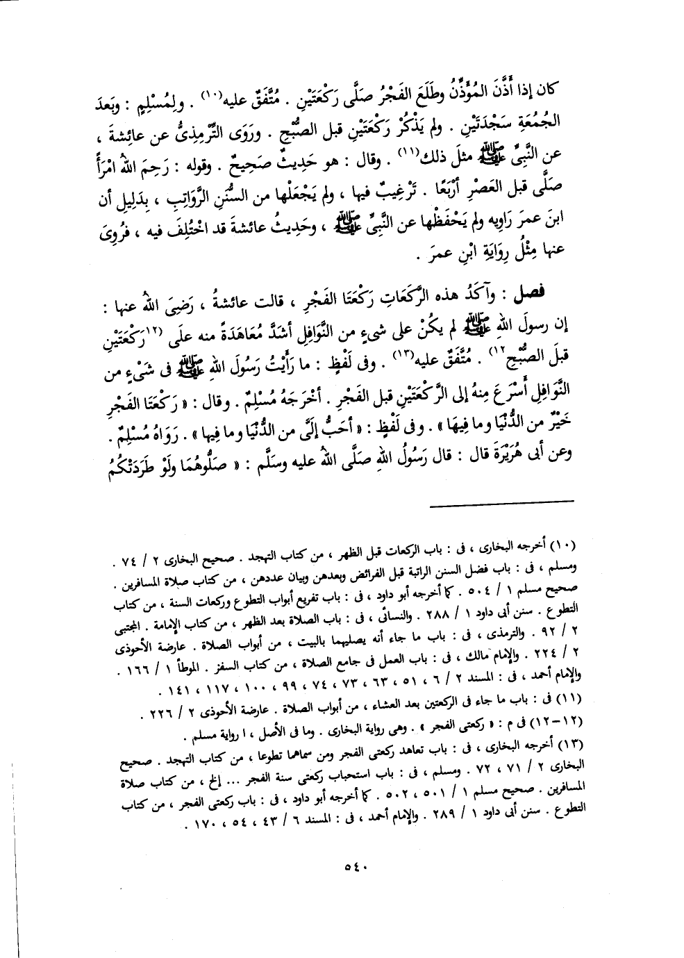 كان إذا أذَّنَ المُؤَذِّنُ وطَلَعَ الفَجْرُ صَلَّى رَكْعَتَيْنِ. مُتَّفَقٌ عليه (١٠). ولِمُسْلِمٍ: وبَعدَ الجُمُعَةِ سَجْدَتَيْنِ. ولم يَذْكُرْ رَكْعَتَيْنِ قبل الصُّبْحِ. ورَوَى التِّرْمِذِىُّ عن عائِشةَ، عن النَّبِيِّ -صلى اللَّه عليه وسلم- مثلَ ذلك (١١). وقال: هو حَدِيثٌ صَحِيحٌ. وقوله: رَحِمَ اللهُ امْرَأً صَلَّى قبل العَصْرِ أرْبَعًا. تَرْغِيبٌ فيها، ولم يَجْعَلْها من السُّنَنِ الرَّوَاتِبِ، بِدَلِيلِ أن ابنَ عمرَ رَاوِيه ولم يَحْفَظْها عن النَّبِيِّ -صلى اللَّه عليه وسلم-، وحَدِيثُ عائشةَ قد اخْتُلِفَ فيه، فرُوِىَ عنها مِثْلُ رِوَايَةِ ابْنِ عمرَ.