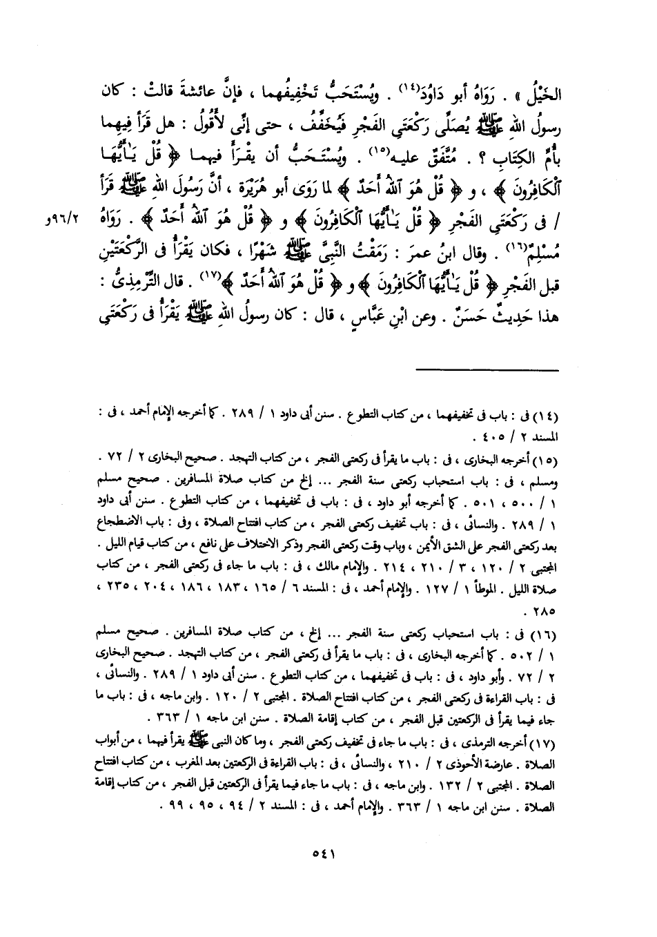 الخَيْلُ". رَوَاهُ أبو دَاوُدَ (١٤). ويُسْتَحَبُّ تَخْفِيفُهما، فإنَّ عائشةَ قالتْ: كان رسولُ اللهِ -صلى اللَّه عليه وسلم- يُصَلِّى رَكْعَتَى الفَجْرِ فَيُخَفِّفُ، حتى إنِّي لأَقُولُ: هل قَرَأ فِيهِما بأُمِّ الكِتَابِ؟ . مُتَّفَقٌ عليه (١٥). ويُسْتَحَبُّ أن يقْرَأَ فيهما {قُلْ يَاأَيُّهَا الْكَافِرُونَ}، و {قُلْ هُوَ اللَّهُ أَحَدٌ} لما رَوَى أبو هُرَيْرَة، أنَّ رَسُولَ اللهِ -صلى اللَّه عليه وسلم- قَرَأ في رَكْعَتَىِ الفَجْرِ {قُلْ يَاأَيُّهَا الْكَافِرُونَ}، و {قُلْ هُوَ اللَّهُ أَحَدٌ}. رَوَاهُ مُسْلِمٌ (١٦). وقال ابنُ عمرَ: رَمَقْتُ النَّبِىَّ -صلى اللَّه عليه وسلم- شَهْرًا، فكان يَقْرَأُ في الرَّكْعَتَيْنِ قبل الفَجْرِ {قُلْ يَاأَيُّهَا الْكَافِرُونَ}، و {قُلْ هُوَ اللَّهُ أَحَدٌ} (١٧). قال التِّرْمِذِىُّ: هذا حَدِيثٌ حَسَنٌ. وعن ابْنِ عَبَّاسٍ، قال: كان رسولُ اللهِ -صلى اللَّه عليه وسلم- يَقْرَأُ في رَكْعَتَىِ