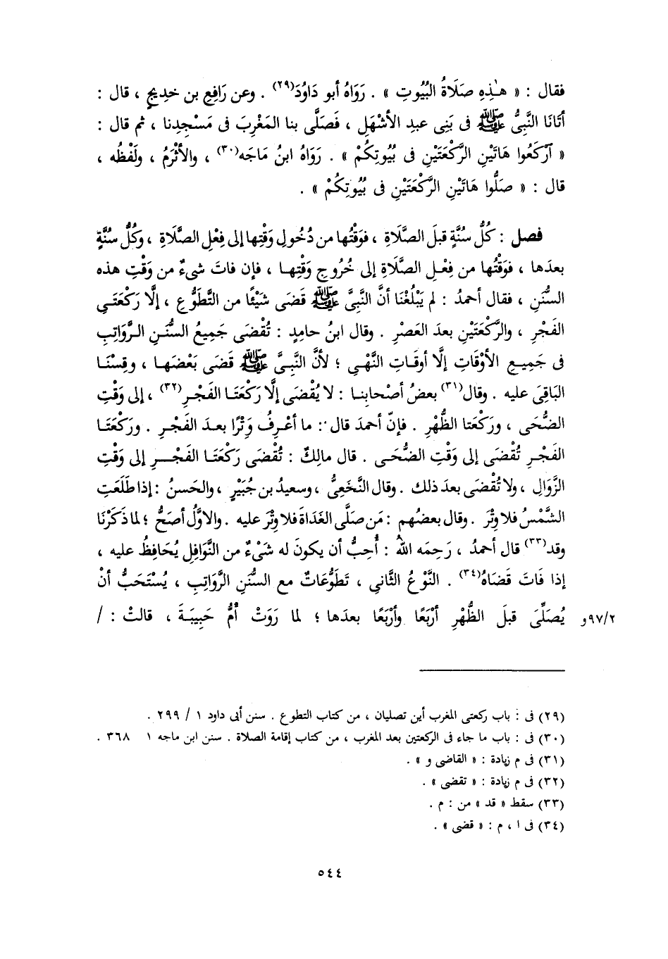 فقال: "هذِهِ صَلَاةُ البُيُوتِ". رَوَاهُ أبو دَاوُدَ (٢٩). وعن رَافِعِ بن خدِيجٍ، قال: أتَانَا النَّبِىُّ -صلى اللَّه عليه وسلم- في بَنِى عبدِ الأشْهَلِ، فَصَلَّى بنا المَغْرِبَ في مَسْجِدِنا، ثم قال: "ارْكَعُوا هَاتَيْنِ الرَّكْعَتَيْنِ في بُيُوتِكُمْ"، رَوَاهُ ابنُ مَاجَه (٣٠)، والأثْرَمُ، ولَفْظُه، قال: "صَلُّوا هَاتَيْنِ الرَّكْعَتَيْنِ في بُيُوتِكُمْ".