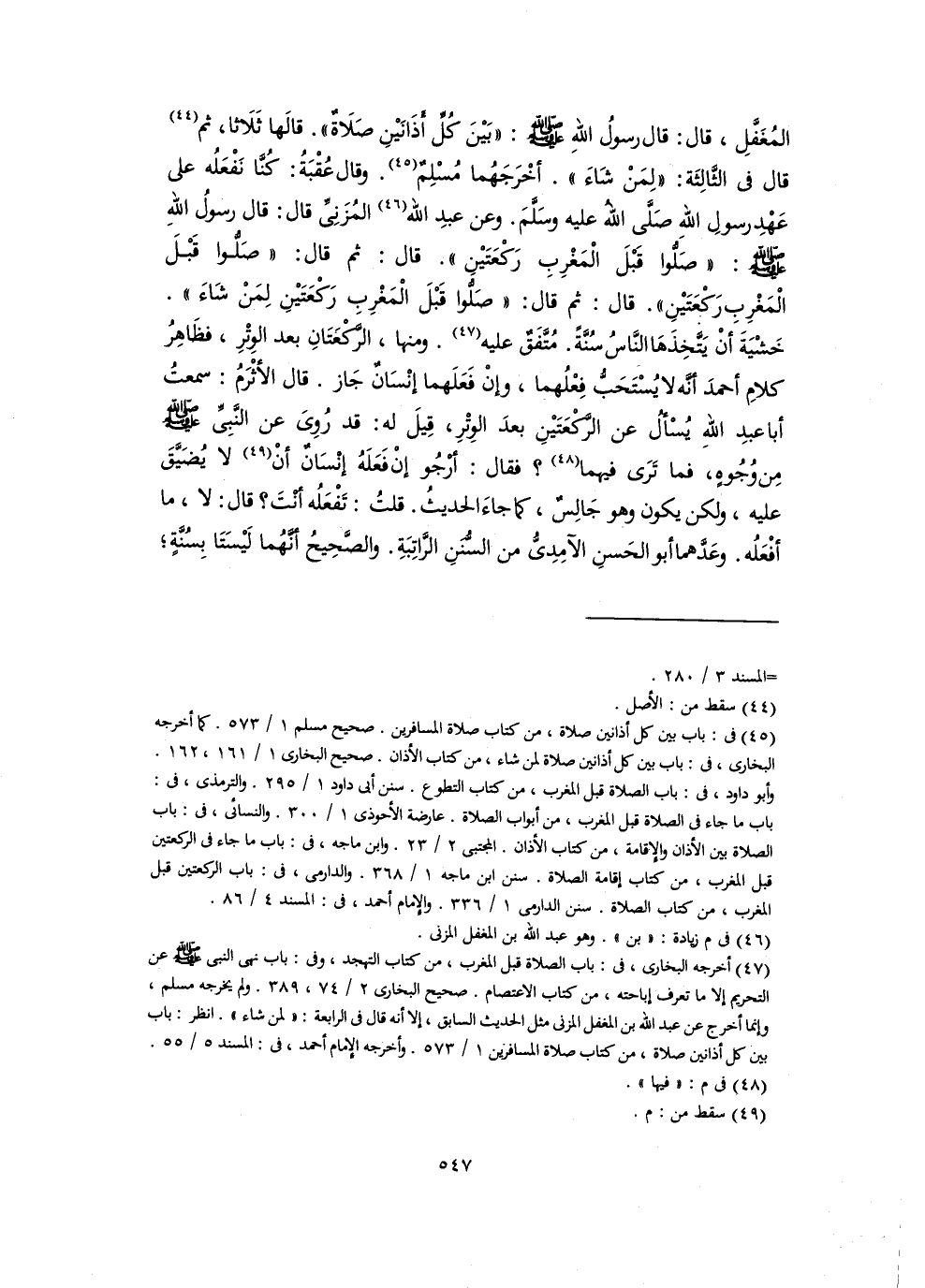 المُغَفَّلِ، قال: قال رسولُ اللهِ -صلى اللَّه عليه وسلم-: "بَيْنَ كُلِّ أذَانَيْنِ صَلَاةٌ". قالَها ثَلَاثًا، ثم (٤٤) قال في الثَّالِثَة: "لِمَنْ شَاءَ". أخْرَجَهُما مُسْلِمٌ (٤٥). وقال عُقْبَةُ: كُنَّا نَفْعَلُه على عَهْدِ رسولِ اللهِ صَلَّى اللهُ عليه وسَلَّمَ. وعن عبدِ اللَّه (٤٦) المُزَنِيِّ قال: قال رسولُ اللهِ -صلى اللَّه عليه وسلم-: "صَلُّوا قَبْلَ الْمَغْرِبِ رَكْعَتَيْنِ". قال: ثم قال: "صَلُّوا قَبْلَ الْمَغْرِبِ رَكْعَتَيْنِ". قال: ثم قال: "صَلُّوا قَبْلَ الْمَغْرِبِ رَكْعَتَيْنِ لِمَنْ شَاءَ". خَشْيَةَ أنْ يَتَّخِذَهَا النَّاسُ سُنَّةً. مُتَّفَقٌ عليه (٤٧). ومنها، الرَّكْعَتَانِ بعد الوِتْرِ، فظَاهِرُ كلامِ أحمدَ أنَّه لا يُسْتَحَبُّ فِعْلُهما، وإنْ فَعَلَهما إنْسَانٌ جَاز. قال الأثْرَمُ: سمعتُ أبا عبدِ اللهِ يُسْألُ عن الرَّكْعَتَيْنِ بعدَ الوِتْرِ، قِيلَ له: قد رُوِىَ عن النَّبِيِّ -صلى اللَّه عليه وسلم- مِن وُجُوهٍ، فما تَرَى فيهما (٤٨)؟ فقال: أرْجُو إنْ فَعَلَهُ إنْسَانٌ أنْ (٤٩) لا يُضَيَّقَ عليه، ولكن يكون وهو جَالِسٌ، كما جاءَ الحديثُ. قلتُ: تَفْعَلُه أنْتَ؟ قال: لا، ما أفْعَلُه. وعَدَّهما أبو الحَسنِ الآمِدِيُّ من السُّنَنِ الرَّاتِبَةِ. والصَّحِيحُ أنَّهُما لَيْسَتَا بِسُنَّةٍ؛