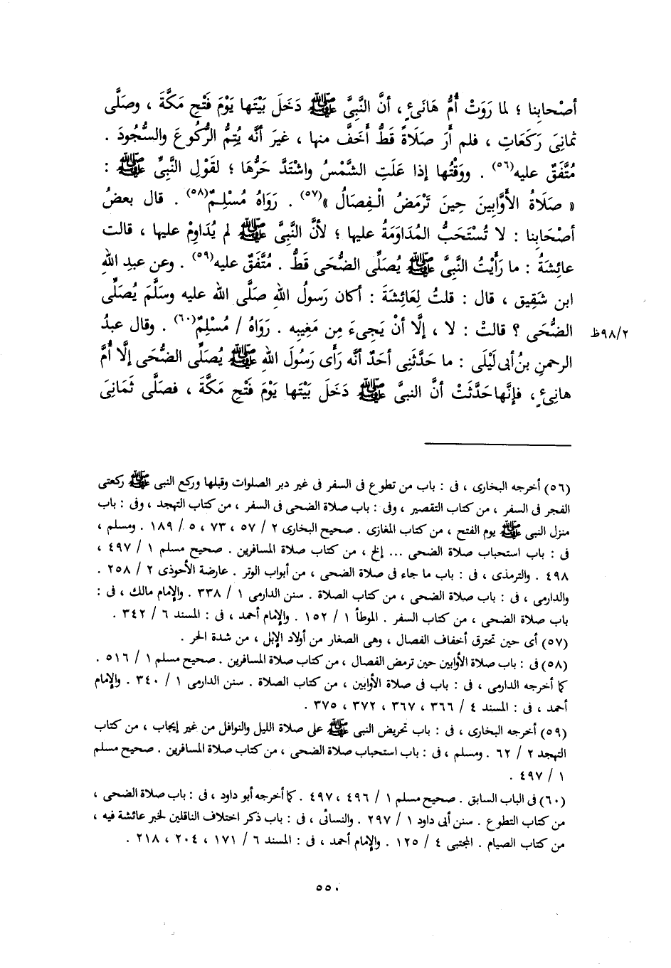 أصْحابِنا؛ لما رَوَتْ أُمُّ هَانَئٍ، أنَّ النَّبِيَّ -صلى اللَّه عليه وسلم- دَخَلَ بَيْتَها يَوْمَ فَتْحِ مَكَّةَ، وصَلَّى ثمانِىَ رَكَعَاتِ، فلم أَرَ صَلَاةً قَطُّ أَخَفَّ منها، غيرَ أنَّه يُتِمُّ الرُّكُوعَ والسُّجُودَ. مُتَّفَقٌ عليه (٥٦). ووَقْتُها إذا عَلَتِ الشَّمْسُ واشْتَدَّ حَرُّهَا؛ لقَوْلِ النَّبِيِّ -صلى اللَّه عليه وسلم-: "صَلَاةُ الأَوَّابِينَ حِينَ تَرْمَضُ الْفِصَالُ" (٥٧). رَوَاهُ مُسْلِمٌ (٥٨). قال بعضُ أصْحَابِنا: لا تُسْتَحَبُّ المُدَاوَمَةُ عليها؛ لأنَّ النَّبِيَّ -صلى اللَّه عليه وسلم- لم يُدَاوِمْ عليها، قالت عائِشَةُ: ما رَأَيْتُ النَّبِيَّ -صلى اللَّه عليه وسلم- يُصَلِّى الضُّحَى قَطُّ. مُتَّفَقٌ عليه (٥٩). وعن عبدِ اللهِ بن شَقِيق، قال: قلتُ لِعَائِشَةَ: أكان رَسولُ اللهِ صَلَّى اللَّه عليه وسَلَّمَ يُصَلِّى الضُّحَى؟ قالتْ: لا، إلَّا أنْ يَجِىءَ مِن مَغِيبِه. رَوَاهُ مُسْلِمٌ (٦٠). وقال عبدُ الرحمنِ بنُ أبي لَيْلَى: ما حَدَّثَنِي أحَدٌ أنَّه رَأَى رَسُولَ اللهِ -صلى اللَّه عليه وسلم- يُصَلِّى الضُّحَى إلَّا أُمَّ هانِئٍ، فإنَّها حَدَّثَتْ أنَّ النبيَّ -صلى اللَّه عليه وسلم- دَخَلَ بَيْتَها يَوْمَ فَتْحِ مَكَّةَ، فصَلَّى ثَمَانِىَ