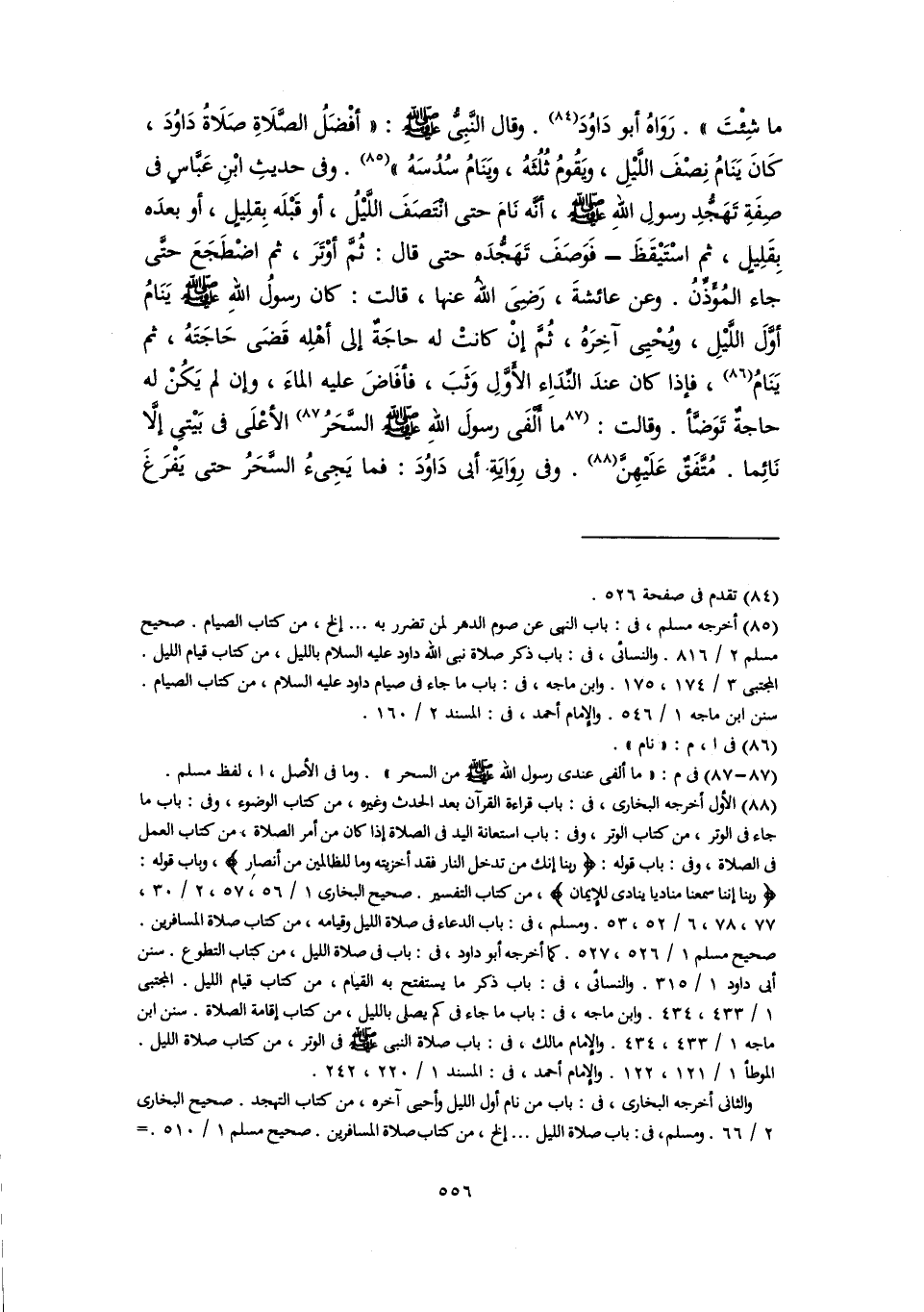 ما شِئْتَ". رَوَاهُ أبو دَاوُدَ (٨٤). وقال النَّبِيُّ -صلى اللَّه عليه وسلم-: "أفْضَلُ الصَّلَاةِ صَلَاةُ دَاوُدَ، كَانَ يَنَامُ نِصْفَ اللَّيْلِ، ويَقُومُ ثُلُثَهُ، ويَنَامُ سُدُسَهُ" (٨٥). وفي حديثِ ابْنِ عَبَّاسٍ في صِفَةِ تَهَجُّدِ رسولِ اللهِ -صلى اللَّه عليه وسلم-، أنَّه نَامَ حتى انْتَصَفَ اللَّيْلُ، أو قَبْلَه بِقلِيلٍ، أو بعدَه بِقَلِيلٍ، ثم اسْتَيْقَظَ - فَوَصَفَ تَهَجُّدَه حتى قال: ثُمَّ أوْتَرَ، ثم اضْطَجَعَ حتَّى جاء المُؤَذِّنُ. وعن عائشةَ، رَضِىَ اللهُ عنها، قالت: كان رسولُ اللهِ -صلى اللَّه عليه وسلم- يَنَامُ أوَّلَ اللَّيْلِ، ويُحْيِى آخِرَهُ، ثُمَّ إنْ كانتْ له حاجَةٌ إلى أهْلِه قَضَى حَاجَتَهُ، ثم يَنَامُ (٨٦)، فإذا كان عندَ النِّدَاءِ الأَوَّلِ وَثَبَ، فأفَاضَ عليه الماءَ، وإن لم يَكُنْ له حاجةٌ تَوَضَّأ. وقالت: [ما أَلْفَى رسولَ اللهِ -صلى اللَّه عليه وسلم- السَّحَرُ] (٨٧) الأعْلَى في بَيْتِي إلَّا نَائِما. مُتَّفَقٌ عَلَيْهِنَّ (٨٨). وفي رِوَايَةِ أبي دَاوُدَ: فما يَجِىءُ السَّحَرُ حتى يَفْرَغَ