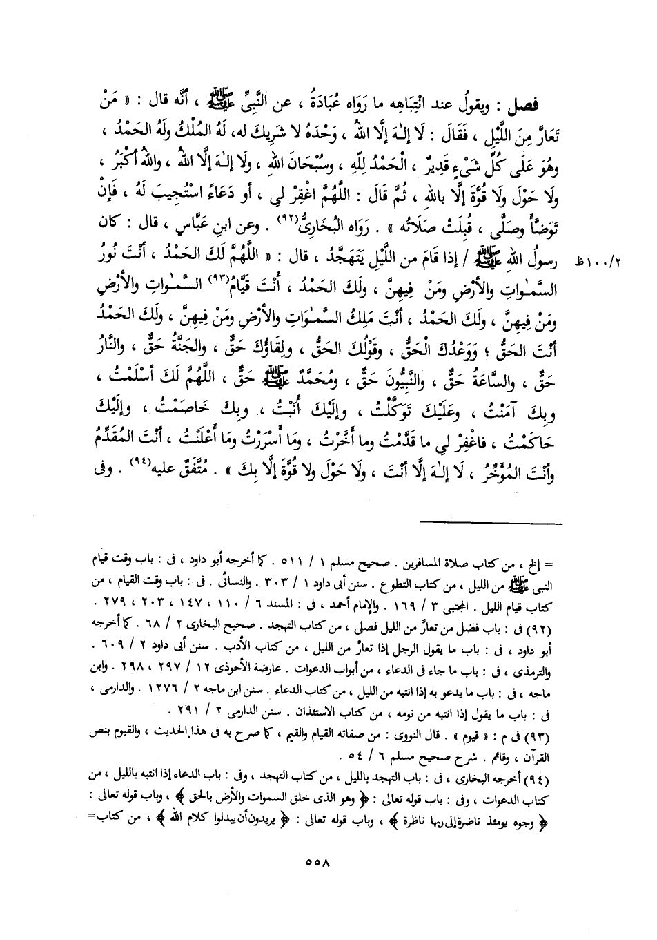 فصل: ويقولُ عند انْتِبَاهِه ما رَوَاه عُبَادَةُ، عن النَّبِيِّ -صلى اللَّه عليه وسلم-, أنَّه قال: "مَنْ تَعَارَّ مِنَ اللَّيْلِ، فَقَالَ: لَا إلهَ إلَّا اللهُ، وَحْدَهُ لا شَرِيكَ له، لَهُ المُلْكُ ولَهُ الحَمْدُ، وهُوَ عَلَى كُلِّ شَىْءٍ قَدِيرٌ، الْحَمْدُ لِلّهِ، وسُبْحَانَ اللهِ، ولَا إلهَ إلَّا اللهُ، واللهُ أكْبَرُ، ولَا حَوْلَ وَلا قُوَّةَ إلَّا باللهِ، ثُمَّ قَالَ: اللَّهُمَّ اغْفِرْ لِى، أو دَعَاءً اسْتُجِيبَ لَهُ، فَإنْ تَوَضَّأَ وصَلَّى، قُبِلَتْ صَلَاتُه". رَوَاه البُخَارِيُّ (٩٢). وعن ابنِ عَبَّاسٍ، قال: كان رسولُ اللهِ -صلى اللَّه عليه وسلم- إذا قَامَ من اللَّيْلِ يَتَهَجَّدُ، قال: "اللَّهُمَّ لَكَ الحَمْدُ، أنْتَ نُورُ السَّمواتِ والأرْضِ ومَنْ فِيهِنَّ، ولَكَ الحَمْدُ، أَنْتَ قَيَّامُ (٩٣) السَّمواتِ والأرْضِ ومَنْ فِيهِنَّ، ولَكَ الحَمْدُ، أنْتَ مَلِكُ السَّموَاتِ والأرْضِ ومَنْ فِيهِنَّ، ولَكَ الحَمْدُ أنْتَ الحَقُّ؛ وَوَعْدُكَ الْحَقُّ، وقَوْلُكَ الحَقُّ، ولِقَاؤُكَ حَقٌّ، والجَنَّةُ حَقٌّ، والنَّارُ حَقٌّ، والسَّاعَةُ حَقٌّ، والنَّبِيُّونَ حَقٌّ، ومُحَمَّدٌ -صلى اللَّه عليه وسلم- حَقٌّ، اللَّهُمَّ لَكَ أسْلَمْتُ، وبِكَ آمَنْتُ، وعَلَيْكَ تَوَكَّلْتُ، وإلَيْكَ أَنَبْتُ، وبِكَ خَاصَمْتُ، وإلَيْكَ حَاكَمْتُ، فاغْفِرْ لِى ما قَدَّمْتُ وما أَخَّرْتُ، ومَا أَسْرَرْتُ ومَا أَعْلَنْتُ، أنْتَ المُقَدِّمُ وأنْتَ المُؤَخِّرُ، لَا إلهَ إلَّا أنْتَ، ولَا حَوْلَ ولا قُوَّةَ إلَّا بِكَ". مُتَّفَقٌ عليه (٩٤). وفي