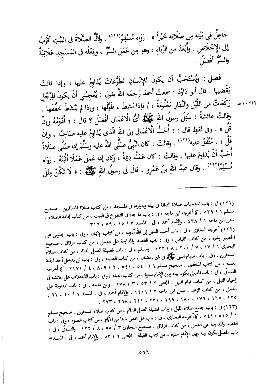 فصل: ويُسْتَحَبُّ أن يكونَ للإِنْسَانِ تَطَوُّعَاتٌ يُدَاوِمُ عليها، وإذا فاتَتْ يَقْضِيها. قال أبو دَاوُدَ: سمعتُ أحمدَ رَحِمَه اللهُ يقول: يُعْجِبُنِي أنْ يكونَ للِرَّجُلِ رَكَعَاتٌ من اللَّيْلِ والنَّهَارِ مَعْلُومَةٌ، فإذا نَشِطَ، طَوَّلَها، وإذا لم يَنْشَطْ خَفَّفَها. وقالتْ عائشةُ: سُئِلَ رسولُ اللهِ -صلى اللَّه عليه وسلم- أيُّ الأَعْمَالِ أفْضَلُ؟ قال: "أَدْوَمُهُ وإنْ قَلَّ". وفي لفظٍ قال: "أَحَبُّ الأَعْمَالِ إلى اللهِ الّذي يُدَاوِمُ عليه صَاحِبُه، وإنْ قَلَّ". مُتَّفَقٌ عليه (١٢٢). وقالتْ: كان النَّبِىُّ صَلَّى اللهُ عليه وسَلَّمَ إذا صَلَّى صَلَاةً أَحَبَّ أنْ يُدَاوِمَ عليها. وقالتْ: كان عَمَلُه دِيمةً، وكان إذا عَمِلَ عَمَلًا أثْبَتَهُ. رَوَاه مُسْلِمٌ (١٢٣). وقال عبدُ اللهِ بنُ عَمْرٍو: قالَ لي رسولُ اللهِ -صلى اللَّه عليه وسلم-: "لَا تَكُنْ مِثْلَ