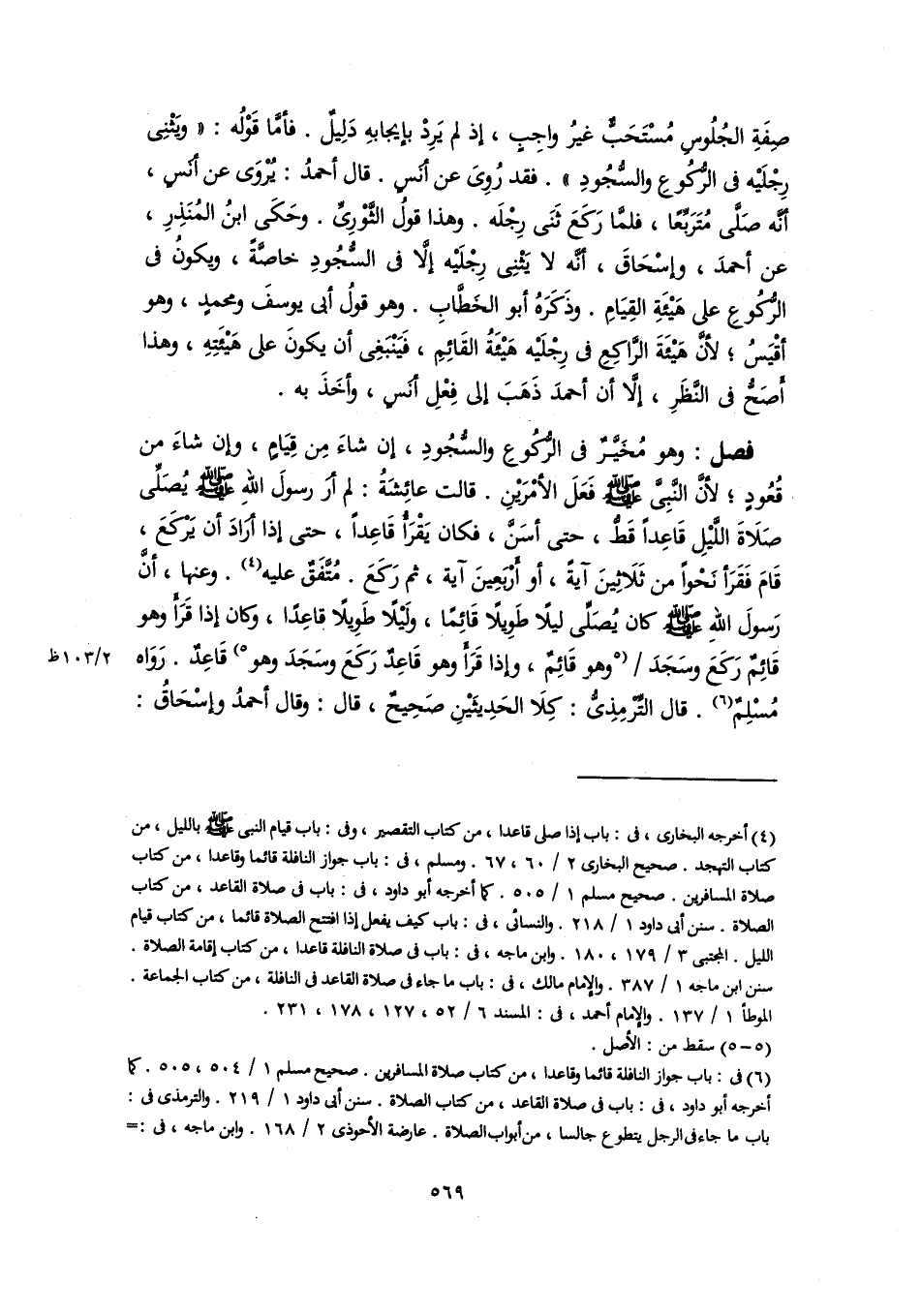 فصل: وهو مُخَيَّرٌ في الرُّكُوعِ والسُّجُودِ، إن شاءَ مِن قِيَامٍ، وإن شاءَ من قُعُودٍ؛ لأنَّ النَّبِيَّ -صلى اللَّه عليه وسلم- فَعَلَ الأمْرَيْنِ. قالت عائِشَةُ: لم أرَ رسولَ اللهِ -صلى اللَّه عليه وسلم- يُصَلِّي صَلَاةَ اللَّيْلِ قَاعِدًا قَطُّ، حتى أسَنَّ، فكان يَقْرَأُ قَاعِدًا، حتى إذا أرَادَ أن يَرْكَعَ، قَامَ فَقَرَأ نَحْوًا من ثَلَاثِينَ آيةً، أو أَرْبَعِينَ آية، ثم رَكَعَ. مُتَّفَقٌ عليه (٤). وعنها، أنَّ رَسولَ اللهِ -صلى اللَّه عليه وسلم- كان يُصَلِّي ليلًا طَوِيلًا قَائِمًا، وَليْلًا طَوِيلًا قاعِدًا، وكان إذا قَرَأَ وهو قَائِمٌ رَكَعَ وسَجَدَ [وهو قَائِمٌ، وإذا قَرَأَ وهو قَاعِدٌ رَكَعَ وسَجَدَ وهو] (٥) قَاعِدٌ. رَوَاه مُسْلِمٌ (٦). قال التِّرْمِذِيُّ: كِلَا الحَدِيثَيْنِ صَحِيحٌ، قال: وقال أحمدُ وإسْحَاقُ: