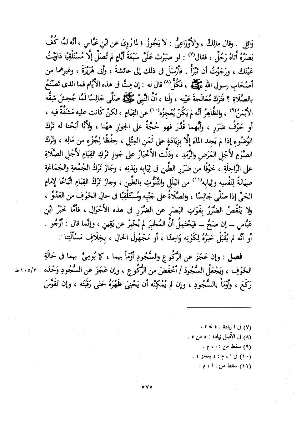 وَائِلٍ. وقال مالِكٌ، والأوْزَاعِىُّ: لا يَجُوزُ؛ لما رُوِىَ عن ابْنِ عَبَّاسٍ، أنَّه لمَّا كُفَّ بَصَرُهُ أَتاهُ رَجُلٌ، فقال (٧): لو صَبَرْتَ عَلَىَّ سَبْعَةَ أيَّامٍ لم تُصَلِّ إلَّا مُسْتَلْقِيًا دَاوَيْتُ عَيْنَكَ، ورَجَوْتُ أن تَبْرَأَ. فأرْسَلَ في ذلك إلى عائشةَ، وأبى هُريْرَةَ، وغيرِهما من أصْحَابِ رسولِ اللهِ -صلى اللَّه عليه وسلم-، فَكُلٌّ (٨) قال له: إن مِتَّ في هذه الأيَّام فما الذي تَصْنَعُ بالصَّلَاةِ؟ فَتَرَكَ مُعَالَجةَ عَيْنِه، ولَنا، أنَّ النَّبِىَّ -صلى اللَّه عليه وسلم- صَلَّى جَالِسًا لَمَّا جُحِشَ شِقُّه الأيْمَنُ (٩)، والظَّاهِرُ أنَّه لم يَكُنْ يُعْجِزُه (١٠) عن القِيَامِ، لكنْ كَانت عليه مَشَقَّةٌ فيه، أو خَوفُ ضَرَرٍ، وأيُّهما قُدِّرَ فهو حُجَّةٌ على الجوازِ ههُنا، ولأنَّا أبَحْنا له تَرْكَ الوُضُوءِ إذا لم يَجِد الماءَ إِلَّا بِزِيَادَةٍ على ثَمَنِ المِثْلِ، حِفْظًا لِجُزْءٍ من مَالِه، وتَرْكَ الصَّوْمِ لأجْلِ المَرَضِ والرَّمَدِ، ودَلَّت الأخْبَارُ على جَوازِ تَرْكِ القِيَامِ لأجْلِ الصَّلَاةِ على الرَّاحِلَةِ، خَوْفًا من ضَرَرِ الطِّينِ في ثِيَابِه وبَدَنِه، وجَازَ تَرْكُ الجُمُعةِ والجَمَاعَةِ صِيَانَةً لِنَفْسِه وثِيابِه (١١) من البَلَلِ والتَّلَوُّثِ بالطِّينِ، وجازَ تَرْكُ القِيَامِ اتِّبَاعًا لإِمامِ الحَىِّ إذا صَلَّى جَالِسًا، والصَّلَاةُ على جَنْبِه ومُسْتَلْقِيًا في حالِ الخَوْفِ من العَدُوِّ، ولا يَنْقُصُ الضَّرَرُ بِفَوَاتِ البَصَرِ عن الضَّرَرِ في هذه الأحْوَالِ، فأمَّا خَبَرُ ابْنِ عَبَّاسٍ - إن صَحَّ - فيَحْتَمِلُ أنَّ المُخْبِرَ لم يُخْبِرْ عن يَقِينٍ، وإنَّما قال: أرْجُو. أو أنَّه لم يُقْبَلْ خَبَرُهُ لِكَوْنِه وَاحِدًا، أو مَجْهُولَ الحالِ، بِخِلَافِ مَسْألَتِنا.
