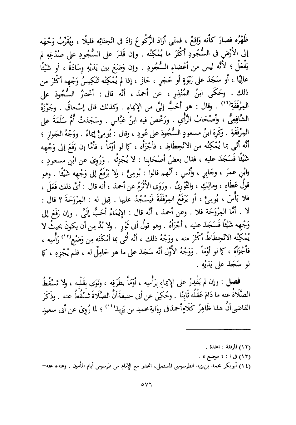 ظَهْرُه فصارَ كأنه وَاقِعٌ، فمتَى أرَادَ الرُّكُوعَ زادَ في انْحِنَائِه قليلًا، ويُقَرِّبُ وَجْهَه إلى الأرْضِ في السُّجُودِ أكْثَرَ ما يُمْكِنُه. وإن قَدَرَ على السُّجُودِ على صُدْغِهِ لم يَفْعَلْ؛ لأنَّه ليس من أعْضاءِ السُّجُودِ. وإن وَضَعَ بين يَدَيْهِ وِسَادَةً، أو شَيْئًا عالِيًا، أو سَجَدَ على رَبْوَةٍ أو حَجَرٍ، جَازَ، إذا لم يُمْكِنْه تَنْكِيسُ وَجْهِه أكْثَرَ من ذلك. وحَكَى ابنُ المُنْذِرِ، عن أحمدَ، أنَّه قال: أخْتارُ السُّجُودَ على المِرْفَقَةِ (١٢). وقال: هو أحَبُّ إلىَّ من الإِيماءِ. وكذلك قال إسْحاقُ. وجَوَّزَهُ الشَّافِعِىُّ، وأصْحَابُ الرَّأْىِ. ورَخَّصَ فيه ابنُ عَبَّاسٍ. وسَجَدَتْ أُمُّ سَلَمَةَ على المِرْفَقَةِ. وكَرِهَ ابنُ مسعودٍ السُّجُودَ على عُودٍ، وقال: يُومِئُ إيماءً. ووَجْهُ الجَوازِ؛ أنَّه أتَى بما يُمْكِنُه من الانْحِطَاطِ، فأجْزَأَه، كما لو أوْمَأَ، فأمَّا إن رَفَعَ إلى وَجْهِه شَيْئًا فَسَجَدَ عليه، فقال بعضُ أصْحَابِنا: لا يُجْزِئُه. وَرُوِىَ عن ابْنِ مسعودٍ، وابْنِ عمرَ، وجَابِرٍ، وأنَسٍ، أنَّهم قالوا: يُومِئُ، ولا يَرْفَعُ إلى وَجْهِه شَيْئًا. وهو قولُ عَطَاءٍ، ومالِكٍ، والثَّوْرِىِّ. ورَوَى الأثْرَمُ عن أحمدَ، أنه قال: أىَّ ذلك فَعَلَ، فلا بَأْسَ، يُومِئُ، أو يَرْفَعُ المِرْفَقَةَ فَيَسْجُدُ عليها. قِيل له: المِرْوَحَةَ؟ قال: لا. أمَّا المِرْوَحَة فلا. وعن أحمدَ، أنَّه قال: الإِيمَاءُ أحَبُّ إلَىَّ. وإن رَفَعَ إلى وَجْهِه شَيْئًا فَسَجَدَ عليه، أجْزَأَهُ. وهو قولُ أبى ثَوْرٍ. ولا بُدَّ مِن أن يكونَ بحيثُ لا يُمْكِنُه الانْحِطَاطُ أكْثَرَ منه، ووَجْهُ ذلك، أنَّه أتَى بما أمْكَنَه مِن وَضْعِ (١٣) رَأْسِه، فأجْزَأهُ، كما لو أوْمَأ. وَوَجْهُ الأَوَّل أنَّه سَجَدَ على ما هو حَامِلٌ له، فلم يُجْزِهِ، كما لو سَجَدَ على يَدَيْهِ.
