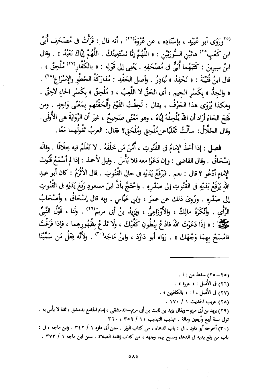 فصل: إذا أخَذَ الإِمامُ في القُنُوتِ، أَمَّنَ مَن خَلْفَهُ. لا نَعْلَمُ فيه خِلَافًا. وقالَه إسْحَاقُ. وقال القاضي: وإن دَعَوْا معه فلا بَأْسَ. وقيل لأحمدَ: إذا لم أسْمَعْ قُنُوتَ الإِمامِ أدْعُو؟ قال: نعم. فيَرْفَعُ يَدَيْهِ في حالِ القُنُوتِ. قال الأثْرَمُ: كان أبو عبدِ اللهِ يَرْفَعُ يَدَيْهِ في القُنُوتِ إلى صَدْرِهِ. واحْتَجَّ بأنَّ ابنَ مسعودٍ رَفَعَ يَدَيْهِ في القُنُوتِ إلى صَدْرِه. ورُوِىَ ذلك عن عمرَ، وابنِ عَبَّاسٍ. وبه قال إسْحَاقُ، وأصْحَابُ الرَّأْىِ. وأنْكَرَهُ مالِكٌ، والأوْزَاعِىُّ، وَيزِيدُ بنُ أبى مريمَ (٢٩). ولَنا، قَوْلُ النَّبِيِّ -صلى اللَّه عليه وسلم-: "إذَا دَعَوْتَ اللهَ فادْعُ بِبُطُونِ كَفَّيْكَ، وَلا تَدْعُ بِظُهُورِهِما، فإذا فَرَغْتَ فامْسَحْ بِهِمَا وَجْهَكَ". رَوَاه أبو دَاوُدَ، وابنُ مَاجَه (٣٠). ولأنَّه فِعْلُ مَن سَمَّيْنَا