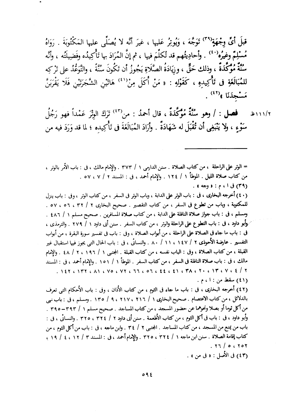 قبلَ أىِّ وِجْهَةٍ (٣٩) تَوَجَّهَ، وَيُوتِرُ عَليها، غيرَ أنَّه لا يُصَلِّى عليها المَكْتُوبَةَ. رَوَاهُ مُسْلِمٌ وغيرُه (٤٠). وأحادِيثُهم قد تُكلِّمَ فيها، ثم إنَّ المُرَادَ بها تَأْكِيدُه وفَضِيلَتُه، وأنَّه سُنَّةٌ مُؤَكَّدَةٌ، وذلك حَقٌّ، وزِيَادَةُ الصَّلَاةِ يَجُوزُ أن تَكُونَ سُنَّةً، والتَّوَعُّدُ على تَرْكِه للمُبَالَغةِ في تَأْكيدِهِ، كَقَوْلهِ: "مَنْ أَكَلَ مِنْ (٤١) هَاتَيْنِ الشَّجَرَتَيْنِ فَلا يَقرَبَنَّ مَسْجِدَنَا" (٤٢).