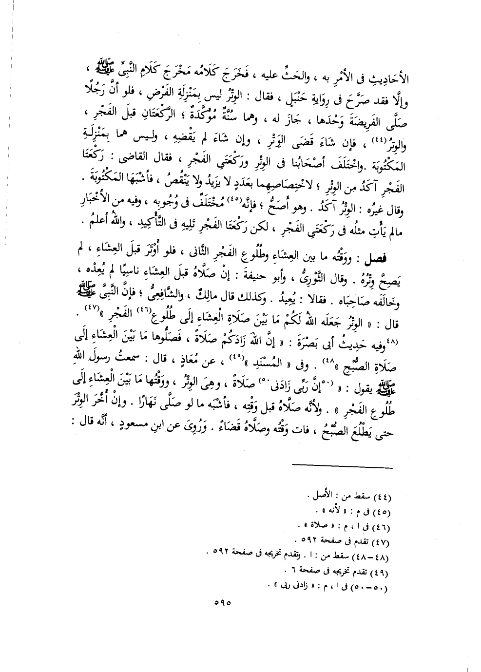 فصل: ووَقْتُه ما بين العِشَاءِ وطُلُوعِ الفَجْرِ الثَّانى، فلو أَوْتَرَ قبلَ العِشَاءِ، لم يَصِحَّ وِتْرُهُ. وقال الثَّوْرِىُّ، وأبو حنيفةَ: إنْ صَلَّاهُ قبلَ العِشَاءِ ناسِيًا لم يُعِدْه، وخَالَفَه صَاحِبَاه. فقالا: يُعِيدُ. وكذلك قال مالِكٌ، والشَّافِعِىُّ؛ فإنَّ النَّبِىَّ -صلى اللَّه عليه وسلم- قال: "الوِتْرُ جَعَلَه اللهُ لَكُمْ مَا بَيْنَ صَلَاةِ الْعِشَاءِ إلَى طُلُوعِ (٤٦) الفَجْرِ" (٤٧). [وفيه حَدِيثُ أبى بَصْرَةَ: "إنَّ اللهَ زَادَكُمْ صَلَاةً، فَصَلُّوها مَا بَيْنَ الْعِشَاءِ إلَى صَلَاةِ الصُّبْحِ"] (٤٨). وفى "المُسْنَدِ" (٤٩)، عن مُعَاذٍ، قال: سمعتُ رسولَ اللهِ -صلى اللَّه عليه وسلم- يقول: " [إنَّ رَبِّى زَادَنى] (٥٠) صَلَاةً، وهِىَ الوِتْرُ، ووَقْتُها مَا بَيْنَ الْعِشَاءِ إلَى طُلُوعِ الفَجْرِ". ولأنَّه صَلَّاهُ قبل وَقْتِه، فأشْبَه ما لو صَلَّى نَهَارًا. وإنْ أَخَّرَ الوِتْرَ حتى يَطْلُعَ الصُّبْحُ، فات وَقْتُه وصَلَّاهُ قَضَاءً. وَرُوِىَ عن ابنِ مسعودٍ، أنَّه قال: