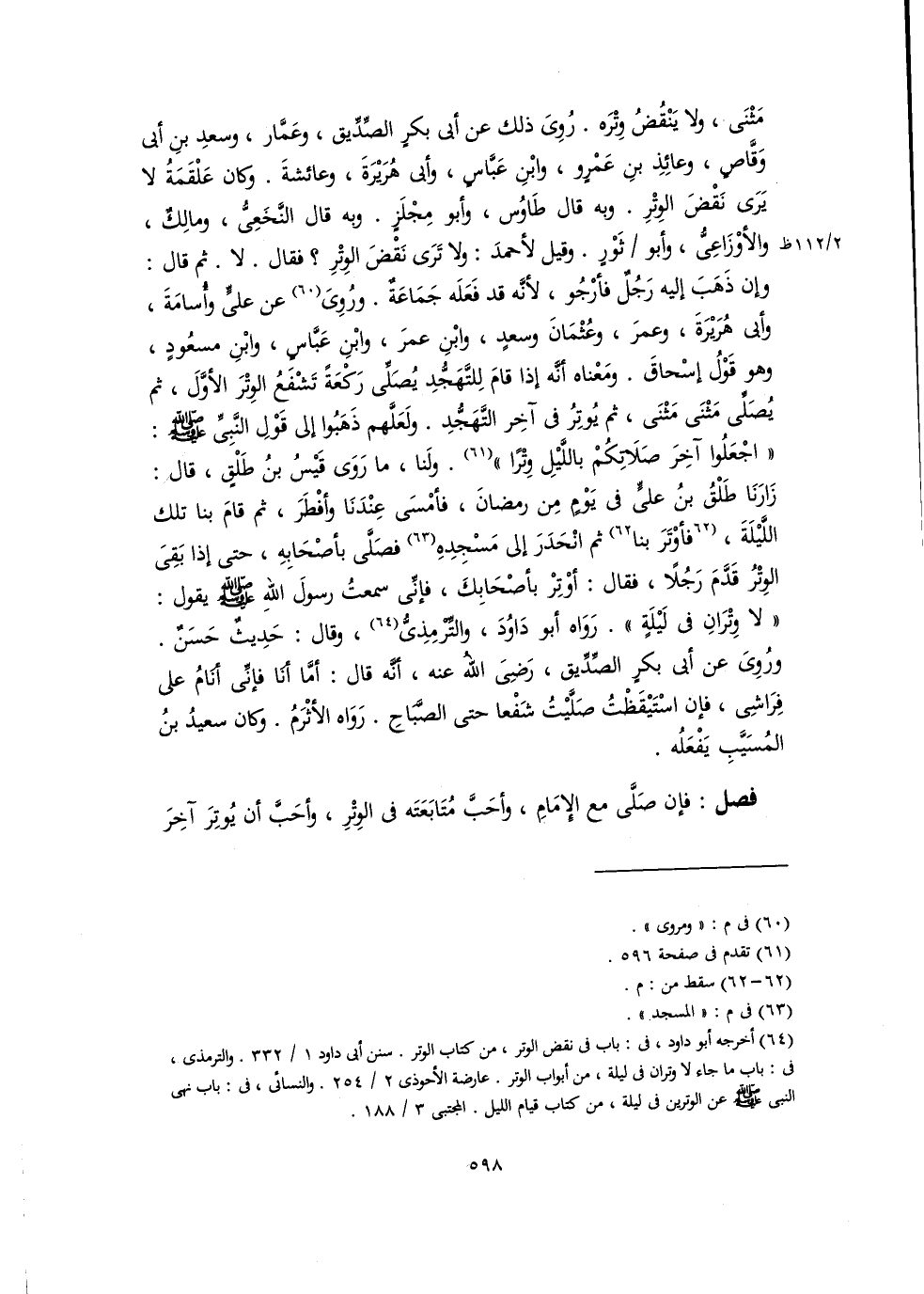 مَثْنَى، ولا يَنْقُضُ وِتْرَه. رُوِىَ ذلك عن أبي بكرٍ الصِّدِّيق، وعَمَّار، وسعدِ بنِ أبي وَقَّاصٍ، وعائِذِ بنِ عَمْرٍو، وابْنِ عَبَّاسٍ، وأبى هُرَيْرَةَ، وعائشةَ. وكان عَلْقَمَةُ لا يَرَى نَقْضَ الوِتْرِ. وبه قال طَاوُس، وأبو مِجْلَزٍ. وبه قال النَّخَعِىُّ، ومالِكٌ، والأوْزَاعِىُّ، وأبو ثَوْرٍ. وقيل لأحمدَ: ولا تَرَى نَقْضَ الوِتْرِ؟ فقال. لا. ثم قال: وإن ذَهَبَ إليه رَجُلٌ فأرْجُو، لأنَّه قد فَعَلَه جَمَاعَةٌ. ورُوِىَ (٦٠) عن عليٍّ وأُسامَةَ، وأبى هُرَيْرَةَ، وعمرَ، وعُثْمَانَ وسعدٍ، وابْنِ عمرَ، وابْنِ عَبَّاسٍ، وابْنِ مسعُودٍ، وهو قَوْلُ إسْحاقَ. ومَعْناه أنَّه إذا قامَ لِلتَّهَجُّدِ يُصَلِّى رَكْعَةً تَشْفَعُ الوِتْرَ الأوَّلَ، ثم يُصَلِّى مَثْنَى مَثْنَى، ثم يُوتِرُ في آخِر التَّهَجُّدِ. ولَعَلَّهم ذَهَبُوا إلى قَوْلِ النَّبِيِّ -صلى اللَّه عليه وسلم-: "اجْعَلُوا آخِرَ صَلَاتِكُمْ باللَّيْلِ وِتْرًا" (٦١). ولَنا، ما رَوَى قَيْسُ بنُ طَلْقٍ، قال: زَارَنَا طَلْقُ بنُ عليٍّ في يَوْمٍ مِن رمضانَ، فأمْسَى عِنْدَنَا وأفْطَرَ، ثم قامَ بنا تلك اللَّيْلَةَ، [فأوْتَرَ بنا] (٦٢) ثم انْحَدَرَ إلى مَسْجِدِهِ (٦٣) فصَلَّى بأصْحَابِهِ، حتى إذا بَقِىَ الوِتْرُ قَدَّمَ رَجُلًا، فقال: أوْتِرْ بأصْحَابِكَ، فإنِّى سمعتُ رسولَ اللهِ -صلى اللَّه عليه وسلم- يقول: "لا وِتْرَانِ في لَيْلَةٍ". رَوَاه أبو دَاوُدَ، والتِّرمِذِىُّ (٦٤)، وقال: حَدِيثٌ حَسَنٌ. ورُوِىَ عن أبي بكرٍ الصِّدِّيق، رضي اللَّه عنه، أنَّه قال: أمَّا أنَا فإنِّى أنَامُ على فِرَاشِى، فإن اسْتيْقَظْتُ صَلَّيْتُ شَفْعا حتى الصَّبَاحِ. رَوَاه الأثْرَمُ. وكان سعيدُ بنُ المُسَيَّبِ يَفْعَلُه.