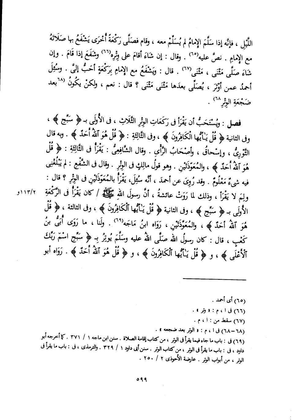 (٦٩) في: باب ما جاء فيما يقرأ في الوتر، من كتاب إقامة الصلاة. سنن ابن ماجه ١/ ٣٧١. كما أخرجه أبو داود، في: باب ما يقرأ في الوتر، من كتاب الوتر. سنن أبي داود ١/ ٣٢٩. والترمذي، في: باب ما يقرأ في الوتر، من أبواب الوتر. عارضة الأحوذى ٢/ ٢٥٠.