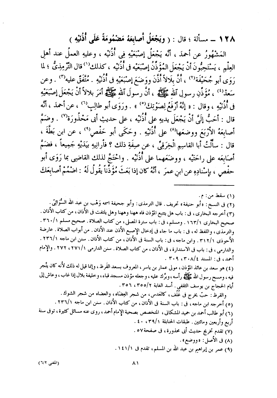 المَشْهُورُ عن أحمدَ، أَنَّه يَجْعَلُ إصْبَعَيْهِ في أُذُنَيْهِ، وعليهِ العملُ عند أهلِ العِلْمِ، يَسْتَحِبُّونَ أنْ يَجْعَلَ المُؤَذِّنُ إصْبَعَيْه في أُذُنَيْهِ، كذلك (١) قال التِّرْمِذِىُّ؛ لما رَوَى أبو جُحَيْفَة (٢)، أَنَّ بلَالًا أَذَّنَ ووَضَعَ إصْبَعَيْهِ في أُذُنَيْهِ. مُتَّفَقٌ عليه (٣). وعن سَعدْ (٤)، مُؤَذِّنِ رسولِ اللَّهِ -صلى اللَّه عليه وسلم-، أنَّ رسولَ اللهِ -صلى اللَّه عليه وسلم- أمَرَ بلالًا أنْ يَجْعَلَ إصْبَعَيْهِ في أُذُنَيْهِ، وقال: "إنَّهُ أَرفَعُ لِصَوْتِكَ (٥) ". ورَوَى أبو طالِبٍ (٦)، عن أحمدَ، أَنَّه قال: أحَبُّ إلَىَّ أنْ يَجْعَلَ يديهِ على أُذُنَيْهِ، على حديثِ أبي مَحْذُورَة (٧). وضَمَّ أصابِعَهُ الأرْبَعَ ووضعَها (٨) على أُذُنَيْهِ. وحَكَى أبو حَفْصٍ (٩)، عن ابن بَطَّةَ، قال: سأَلْتُ أبا القاسِمِ الْخِرَقِىِّ، عن صِفَةِ ذلك؟ فأرانِيهِ بيَدَيْهِ جَمِيعًا، فضَمَّ أصَابِعَه على راحَتَيْه، ووضَعَهما على أُذُنَيْهِ. واحْتَجَّ لذلك القاضِى بما رَوَى أبو حفْصٍ، بإسْنادِهِ عن ابنِ عمرَ، أنَّهُ كان إذا بَعَثَ مُؤَذِّنًا يقُولُ لَهُ: اضْمُمْ أصابِعَكَ