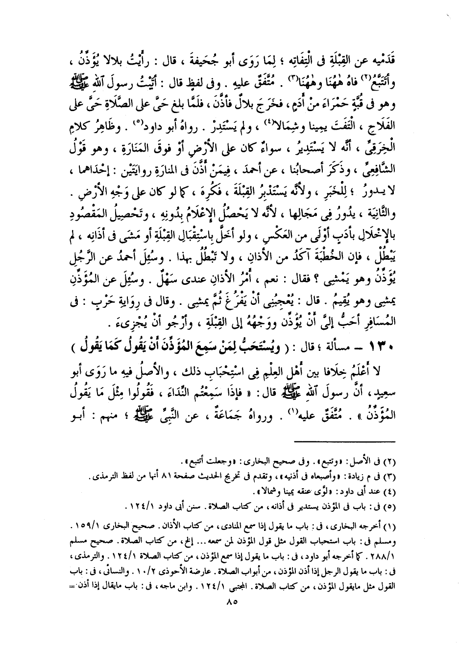 قَدَميْه عن القِبْلَةِ في الْتِفَاتِه؛ لِمَا رَوَى أبو جُحَيفةَ، قال: رَأَيْتُ بلالًا يُؤَذِّنُ، وأتَتَبَّعُ (٢) فاهُ ههُنَا وههُنَا (٣). مُتَّفَقٌ عليهِ. وفى لفظٍ قال: أَتَيْتُ رسولَ اللهِ -صلى اللَّه عليه وسلم- وهو في قُبَّةٍ حَمْرَاءَ منْ أَدَمٍ، فخَرَجَ بلالٌ فأذَّنَ، فلَمَّا بلغ حَىَّ على الصَّلَاةِ حَىَّ على الفَلَاحِ، الْتَفَتَ يمِينًا وشِمَالًا (٤)، ولم يَسْتَدِرْ. رواهُ أبو داود (٥). وظَاهِرُ كلامِ الْخِرَقِىِّ، أنَّه لا يَسْتَدِيرُ، سواءٌ كان على الأرْضِ أوْ فوقَ المَنَارَةِ، وهو قَوْلُ الشَّافِعِىِّ، وذَكَرَ أصحابُنا، عن أحمدَ، فِيمَنْ أَذَّنَ في المنارَةِ روايَتَيْن: إحْدَاهما، لا يدورُ؛ لِلْخَبَرِ، ولأنَّه يَسْتَدْبِرُ القِبْلَةَ، فَكُرِهَ، كما لو كان على وَجْهِ الأَرْضِ. والثَّانِيَة، يدُورُ في مَجَالِها، لأنَّه لا يَحْصُلُ الإِعْلَامُ بِدُونِهِ، وتَحْصِيلُ المَقْصُودِ بالإِخْلَالِ بأدَبٍ أَوْلَى من العَكْسِ، ولو أخَلَّ بِاسْتِقْبَالِ القِبْلَةِ أو مَشَى في أذَانِه، لم يَبْطُلْ، فإن الخُطْبَةَ آكَدُ من الأذانِ، ولا تَبْطُلُ بهذا. وسُئِلَ أحمدُ عن الرَّجُلِ يُؤَذِّنُ وهو يَمْشِى؟ فقال: نعم، أَمْرُ الأذانِ عندى سَهْلٌ. وسُئِلَ عن المُؤَذِّنِ يمشِى وهو يُقِيمُ. قال: يُعْجِبُنِى أنْ يَفْرُغَ ثُمَّ يمشِى. وقال في رِوَايةِ حَرْبٍ: في المُسَافِرِ أحَبُّ إلىَّ أَنْ يُؤَذِّن ووَجْهُهُ إلى القِبْلَةِ، وأَرْجُو أنْ يُجْزِىءَ.