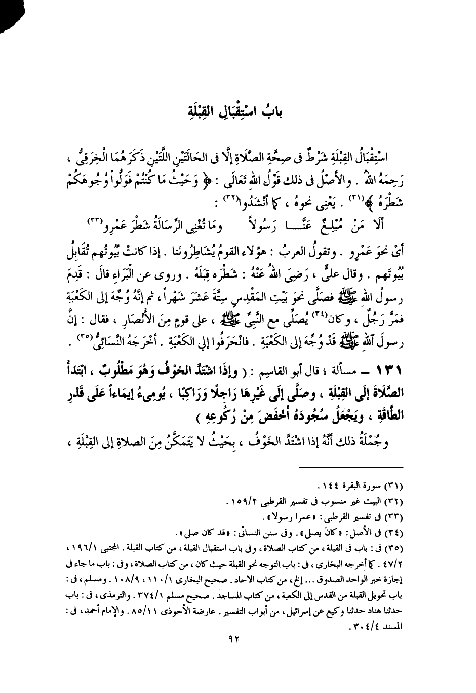 اسْتِقْبَالُ القِبْلَةِ شَرْطٌ في صِحَّةِ الصَّلَاةِ إلَّا في الحَالَتَيْنِ اللَّتَيْنِ ذَكَرَهُمَا الْخِرَقِيُّ، رَحِمَهُ اللهُ. والأصْلُ في ذلك قَوْلُ اللهِ تَعَالَى: {وَحَيْثُ مَا كُنْتُمْ فَوَلُّوا وُجُوهَكُمْ شَطْرَهُ} (٣١). يَعْنِى نحوهُ، كما أَنْشَدُوا (٣٢):