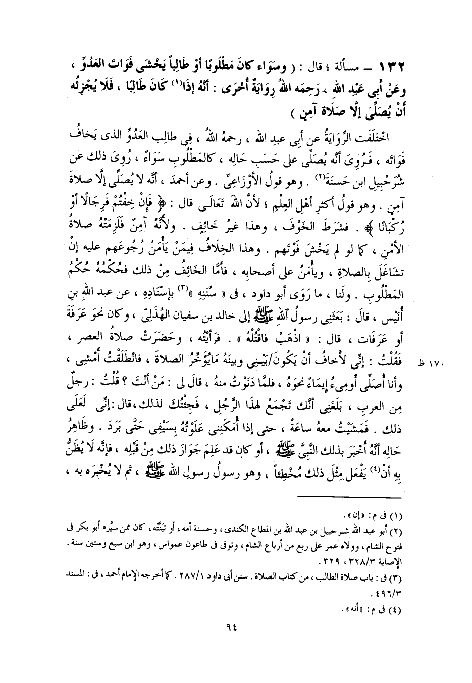 ١٣٢ - مسألة؛ قال: (وسَوَاء كانَ مَطْلْوبًا أوْ طَالِبًا يَخْشَى فَوَاتَ العَدُوِّ، وعَنْ أبِى عَبْدِ اللهِ، رَحِمَه اللهُ رِوَايَةٌ أُخْرَى: أنَّهُ إذَا (١) كَانَ طَالِبًا، فَلَا يُجْزِئُه أنْ يُصَلِّىَ إلَّا صَلَاة آمِنٍ)