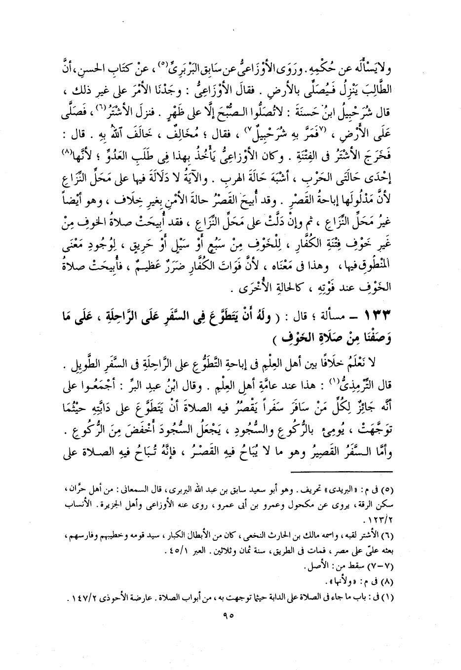 ولا يَسْأَلَه عن حُكْمِهِ. ورَوَى الأوْزَاعىُّ عن سَابِق البَرْبَرِىِّ (٥)، عنْ كتَابِ الحسنِ، أنَّ الطَّالِبَ يَنْزِلُ فَيُصَلِّى بالأرضِ. فقالَ الأوْزَاعِىُّ: وجَدْنَا الأمْرَ على غير ذلك، قال شُرَحْبِيلُ ابنُ حَسنَةَ: لا تُصَلُّوا الصُّبْحَ إلَّا على ظَهْرٍ. فنزلَ الأشْتَرُ (٦)، فَصَلَّى عَلَى الأَرْضِ، [فَمَرَّ بهِ شُرَحْبِيلٌ] (٧)، فقال؛ مُخَالِفٌ، خَالَفَ اللَّه بِهِ. قال: فَخَرَجَ الأشْتَرُ في الفِتْنَةِ. وكان الأوْزاعِىُّ يَأْخُذُ بِهذا في طَلَبِ العَدُوِّ؛ لأنَّها (٨) إحْدَى حَالَتَى الحَرْبِ، أشْبَهَ حَالَةَ الهربِ. والآيَةُ لا دَلَالَةَ فيها على مَحَلِّ النِّزَاعِ لأنَّ مَدْلُولَها إباحةُ القَصْرِ. وقد أُبيحَ القَصْرُ حالةَ الأمْنِ بغيرِ خِلَاف، وهو أيْضًا غيرُ مَحَلِّ النِّزَاعِ، ثم وإنْ دَلَّتْ على مَحَلِّ النِّزَاعِ، فقد أُبِيحَتْ صلاةُ الخوفِ مِنْ غَيرِ خَوْفِ فِتْنَةِ الكُفَّارِ، لِلْخَوْفِ مِنْ سَبُعٍ أَوْ سَيْلٍ أَوْ حَرِيقٍ، لِوُجُودِ مَعْنَى المنْطُوقِ فيها، وهذا في مَعْنَاه، لأنَّ فَوَاتَ الكُفَّارِ ضَرَرٌ عَظيمٌ، فأُبِيحَتْ صلاةُ الخَوْفِ عند فَوْتِهِ، كالحالةِ الأُخْرَى.