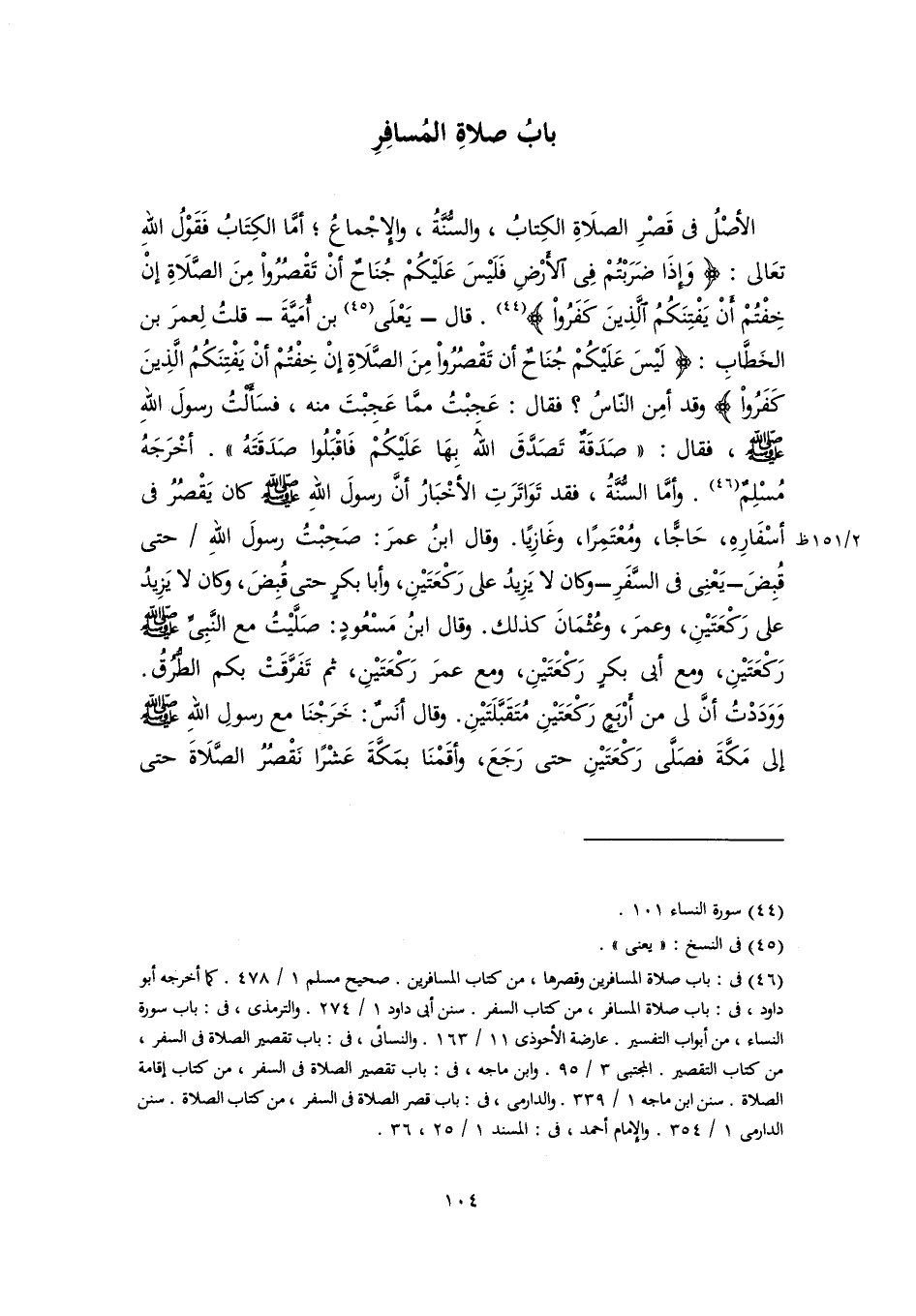 (٤٦) في: باب صلاة المسافرين وقصرها، من كتاب المسافرين. صحيح مسلم ١/ ٤٧٨. كما أخرجه أبو داود، في: باب صلاة المسافر، من كتاب السفر. سنن أبي داود ١/ ٢٧٤. والترمذي، في: باب سورة النساء، من أبواب التفسير. عارضة الأحوذى ١١/ ١٦٣. والنسائي، في: باب تقصير الصلاة في السفر، من كتاب التقصير. المجتبى ٣/ ٩٥. وابن ماجه، في: باب تقصير الصلاة في السفر، من كتاب إقامة الصلاة. سنن ابن ماجه ١/ ٣٣٩. والدارمي، في: باب قصر الصلاة في السفر، من كتاب الصلاة. سنن الدارمي ١/ ٣٥٤. والإِمام أحمد، في: المسند ١/ ٢٥، ٣٦.