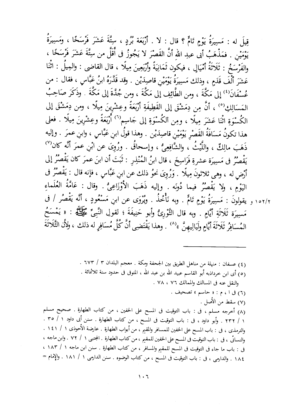 قِيلَ له: مَسِيرَةُ يَوْمٍ تَامٍّ؟ قال: لا. أرْبَعَة بُرُدٍ، سِتَّةَ عَشَرَ فَرْسَخًا، ومَسِيرَةُ يَوْمَيْنِ. فمَذْهَبُ أبي عبدِ اللهِ أنَّ القَصْرَ لا يَجُوزُ في أَقَلَّ من سِتَّةَ عَشَرَ فَرْسَخًا، والفَرْسَخُ: ثَلَاثَةُ أمْيَالٍ، فيكون ثَمَانِيَةً وأرْبَعِينَ مِيلًا، قال القاضي: والمِيلُ: اثْنَا عَشَرَ ألْفَ قَدَمٍ، وذلك مَسِيرَةُ يَوْمَيْنِ قاصِدَيْن. وقد قَدَّرَهُ ابنُ عَبَّاسٍ، فقال: من عُسْفَانَ (٤) إلى مَكَّةَ، ومن الطَّائِفِ إلى مَكَّةَ، ومن جُدَّةَ إلى مَكَّةَ. وذَكَرَ صَاحِبُ المَسَالِكِ (٥)، أنَّ مِن دِمَشْقَ إلى القَطِيفَةِ أرْبَعَةً وعِشْرِينَ مِيلًا، ومن دِمَشْقَ إلى الكُسْوَةِ اثْنَا عَشَرَ مِيلًا، ومِن الكُسْوَةِ إلى جَاسِم (٦) أَرْبَعَةً وعِشْرِينَ مِيلًا. فعلى هذا تكونُ مَسَافَةُ القَصْرِ يَوْمَيْنِ قاصِدَيْن. وهذا قولُ ابنِ عَبَّاسٍ، وابنِ عمرَ. وإليه ذَهَبَ مالِكٌ، واللَّيْثُ، والشَّافِعِىُّ، وإسحاقُ. ورُوِىَ عن ابْنِ عمرَ أنَّه كان (٧) يَقْصُرُ في مَسِيرَة عشرةِ فَرَاسِخَ، قال ابنُ المُنْذِرِ: ثَبَتَ أن ابنَ عمرَ كان يَقْصُرُ إلى أرْضٍ له، وهى ثلاثونَ مِيلًا. وَرُوِىَ نحوُ ذلك عن ابنِ عَبَّاسٍ، فإنه قال: يَقْصُرُ في اليَوْمِ، ولا يَقْصُرُ فيما دُونَه. وإليه ذَهَبَ الأوْزَاعِيُّ. وقال: عَامَّةُ العُلَماءِ يقولونَ: مَسِيرَةُ يَوْمٍ تَامٍّ. وبه نَأْخُذُ. ويُرْوَى عن ابنِ مَسْعُودٍ، أنَّه يَقْصُر في مَسِيرَة ثَلَاثَةِ أيَّامٍ. وبه قال الثَّوْرِىُّ وأبو حَنِيفَةَ؛ لقولِ النَّبِيِّ -صلى اللَّه عليه وسلم-: "يَمْسَحُ المُسَافِرُ ثَلَاثَةَ أيَّامٍ ولَيَالِيهِنَّ" (٨). وهذا يَقْتَضِى أنَّ كُلَّ مُسَافِرٍ له ذلك، ولأن الثَّلَاثَةَ