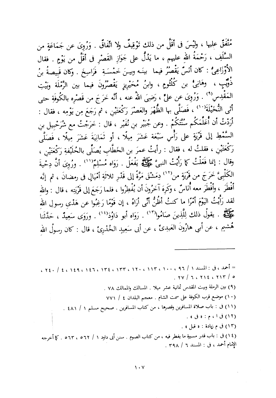 مُتَّفَقٌ عليها، وليْسَ في أقَلَّ من ذلك تَوْقِيفٌ ولا اتِّفَاقٌ. وَرُوِىَ عن جَمَاعَةٍ من السَّلَفِ، رَحْمَةُ اللهِ عليهم، ما يَدُلُّ على جَوَازِ القَصْرِ في أقَلَّ من يَوْمٍ. فقال الأوْزَاعِىُّ: كان أنَسٌ يَقْصُرُ فيما بينَه وبينَ خَمْسَةِ فَرَاسِخَ. وكان قَبِيصةُ بنُ ذُؤَيْبٍ، وهَانِئُ بن كُلْثُومٍ، وابنُ مُحَيْرِيزٍ يَقْصُرُونَ فيما بين الرَّمْلَة وبَيْتِ المَقْدِسِ (٩). وَرُوِىَ عن علىٍّ، رَضِىَ اللهُ عنه، أنَّه خَرَجَ من قَصْرِه بالكُوفَةِ حتى أتَى النُّخَيْلَةَ (١٠)، فَصَلَّى بها الظُّهْرَ والعَصْرَ رَكْعَتَيْنِ، ثم رَجَعَ مِن يَوْمِه، فقال: أرَدْتُ أن أُعَلِّمَكُم سُنَّتَكُمْ. وعن جُبَيْر بنِ نُفَيْر، قال: خَرَجْتُ مع شُرَحْبِيل بنِ السَّمْطِ إلى قَرْيَةٍ على رَأْسِ سَبْعَة عَشَرَ مِيلًا، أو ثَمَانِيَةَ عَشَرَ مِيلًا، فَصَلَّى رَكْعَتَيْنِ، فقلتُ له، فقال: رأيتُ عمرَ بن الخَطَّابِ يُصَلِّى بالحُلَيْفةِ رَكْعَتَيْنِ، وقال: إنما فَعَلْتُ كما رَأَيْتُ النبيَّ -صلى اللَّه عليه وسلم- يَفْعَلُ. رَوَاه مُسْلِمٌ (١١). ورُوِىَ أنَّ دِحْيةَ الكَلْبِىَّ خَرَجَ من قَرْيَةٍ من (١٢) دِمَشْقَ مَرّةً إلى قَدْرِ ثلاثَةِ أمْيَالٍ في رمضانَ، ثم إنَّه أفْطَرَ، وأفْطَرَ معه أُنَاسٌ، وكَرِهَ آخَرُونَ أن يُفْطِرُوا، فلما رَجعَ إلى قَرْيَتِه، قال: واللهِ لقد رَأَيْتُ اليَوْمَ أمْرًا ما كنتُ أظُنُّ أنِّى أرَاهُ، إن قَوْمًا رَغِبُوا عن هَدْىِ رسولِ اللهِ -صلى اللَّه عليه وسلم-. يقولُ ذلك لِلَّذِينَ صَامُوا (١٣). رَوَاه أبو دَاوُدَ (١٤). ورَوَى سَعِيدٌ، حَدَّثَنا هُشيم، عن أبِي هارُونَ العَبدِيِّ، عن أبي سَعِيدٍ الخُدْرِىِّ، قال: كان رسولُ اللهِ