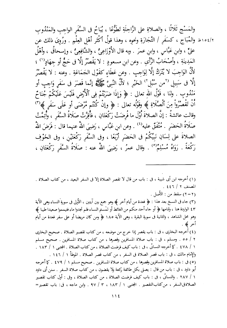 والمَسْحِ ثَلَاثًا، والصلاةِ على الرَّاحِلَةِ تَطَوُّعًا، يُبَاحُ في السَّفَرِ الواجِبِ والمَنْدُوبِ والمُبَاحِ، كسَفَرِ التِّجَارَةِ ونحوِه، وهذا قولُ أكْثَر أهْلِ العِلْمِ. ورُوِىَ ذلك عن عليٍّ، وابنِ عَبَّاسٍ، وابنِ عمرَ. وبه قال الأوْزَاعِىُّ، والشَّافِعِىُّ، وإسحاقُ، وأهْلُ المَدِينَةِ، وأصْحَابُ الرَّأىِ. وعن ابنِ مسعودٍ: لا يَقْصُرُ إلَّا في حَجٍّ أو جِهَادٍ (١)؛ لأنَّ الوَاجِبَ لا يُتْرَكُ إلَّا لِوَاجِبٍ. وعن عَطَاءٍ كقَوْلِ الجَمَاعَةِ. وعنه: لا يَقْصُرُ إلَّا في سَبِيلٍ [من سُبُلِ] (٢) الخَيْرِ؛ لأنَّ النَّبِىَّ -صلى اللَّه عليه وسلم- إنَّما قَصَرَ في سَفَرٍ وَاجِبٍ أو مَنْدُوبٍ. ولنَا، قَوْلُ اللَّه تعالى: {وَإِذَا ضَرَبْتُمْ فِي الْأَرْضِ فَلَيْسَ عَلَيْكُمْ جُنَاحٌ أَنْ تَقْصُرُوا مِنَ الصَّلَاةِ} وقَوْلُه تعالى: {وَإِنْ كُنْتُمْ مَرْضَى أَوْ عَلَى سَفَرٍ} (٣) وقالت عائشةُ: إنَّ الصلاةَ أَوَّلَ ما فُرِضَتْ رَكْعَتَانِ، فأُقِرَّتْ صَلَاةُ السَّفَرِ، وأُتِمَّتْ صَلَاةُ الحَضَرِ. مُتَّفَقٌ عليه (٤). وعن ابنِ عَبَّاسٍ، رَضِىَ اللهُ عنهما قال: فَرَضَ اللهُ الصلاةَ على لِسَانِ نَبِيِّكُمْ في الحَضَرِ أرْبَعًا، وفى السَّفَرِ رَكْعَتَيْنِ، وفى الخَوْفِ رَكْعَةً. رَوَاهُ مُسْلِمٌ (٥). وقال عمرُ، رَضِىَ اللهُ عنه: صَلَاةُ السَّفَرِ رَكْعَتَانِ،