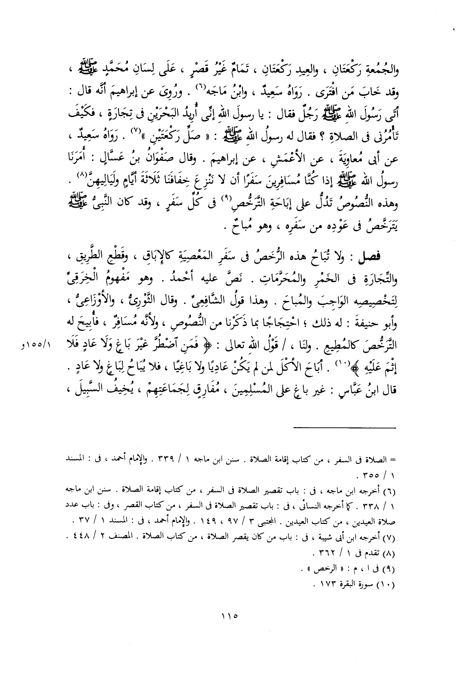 والجُمُعةِ رَكْعَتَانِ، والعِيدِ رَكْعَتَانِ، تَمَامٌ غَيْرُ قَصْرٍ، عَلَى لِسَانِ مُحَمَّدٍ -صلى اللَّه عليه وسلم-، وقد خَابَ مَن افْتَرَى. رَوَاهُ سَعِيدٌ، وابْنُ مَاجَه (٦). ورُوِىَ عن إبراهيمَ أنَّه قال: أتَى رَسُولَ اللهِ -صلى اللَّه عليه وسلم- رَجُلٌ فقال: يا رسولَ اللهِ إنِّي أُرِيدُ البَحْرَيْنِ في تِجَارَةٍ، فكَيْفَ تَأْمُرُنى في الصلاةِ؟ فقال له رسولُ اللهِ -صلى اللَّه عليه وسلم-: "صَلِّ رَكْعَتَيْنِ" (٧). رَوَاهُ سَعِيدٌ، عن أبي مُعاوِيَةَ، عن الأعْمَشِ، عن إبراهيمَ. وقال صَفْوَانُ بنُ عَسَّالٍ: أَمَرَنَا رسولُ اللَّه -صلى اللَّه عليه وسلم- إذا كُنَّا مُسَافِرِينَ سَفَرًا أن لا نَنْزِعَ خِفَافَنَا ثَلَاثَةَ أيَّامٍ ولَيَالِيهِنَّ (٨). وهذه النُّصُوصُ تَدُلُّ على إبَاحَةِ التَّرَخُّصِ (٩) في كُلِّ سَفَرٍ، وقد كان النَّبِىُّ -صلى اللَّه عليه وسلم- يَتَرَخَّصُ في عَوْدِه من سَفَرِه، وهو مُباحٌ.