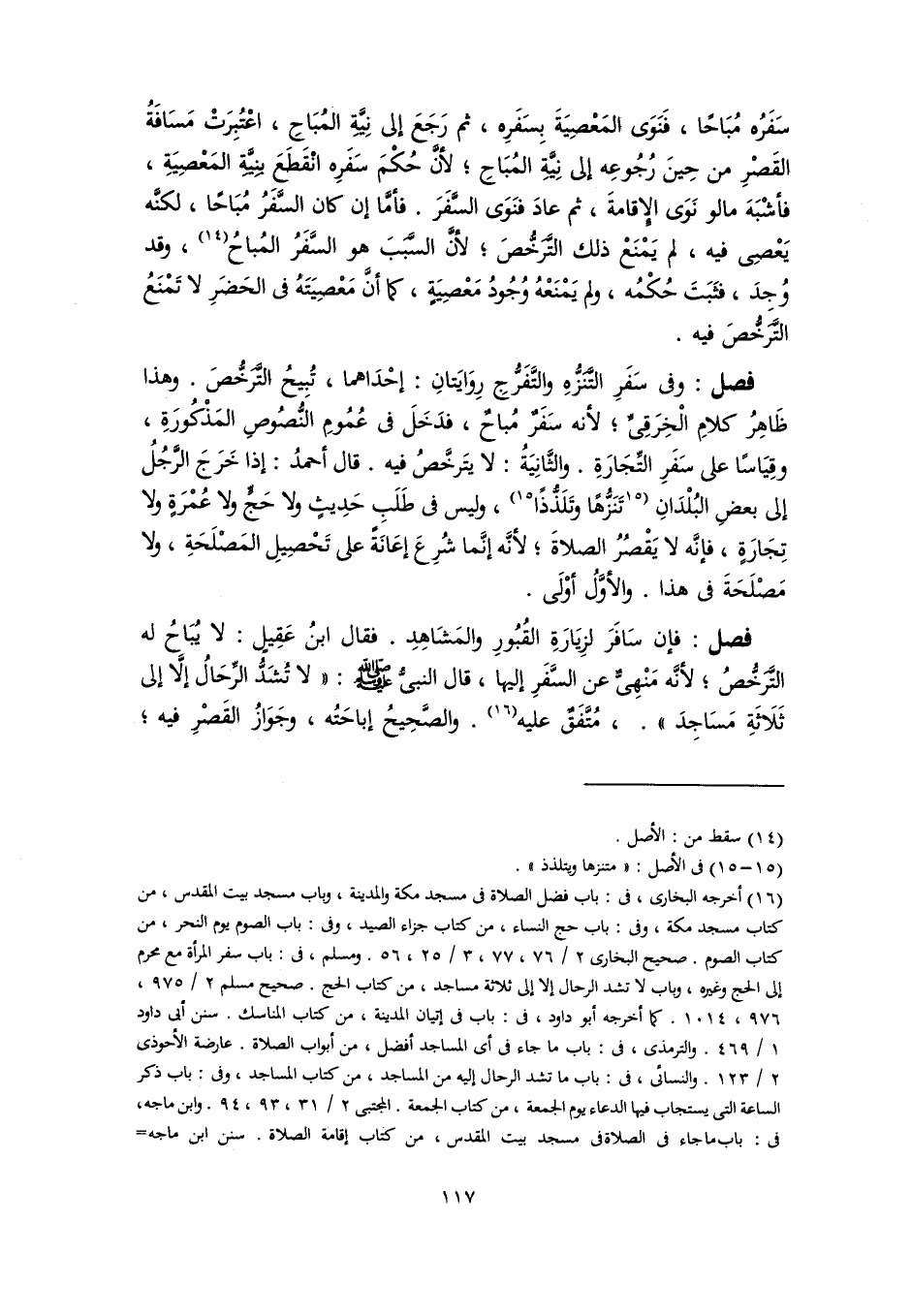 فصل: فإن سَافَرَ لزِيَارَةِ القُبُورِ والمَشَاهِدِ. فقال ابنُ عَقِيلٍ: لا يُبَاحُ له التَّرَخُّصُ؛ لأنَّه مَنْهِىٌّ عنِ السَّفَرِ إليها، قال النبيُّ -صلى اللَّه عليه وسلم-: "لا تُشَدُّ الرِّحَالُ إلَّا إلى ثَلَاثةِ مَسَاجِدَ".، مُتَّفقٌ عليه (١٦). والصَّحِيحُ إباحَتُه، وجَوَازُ القَصْرِ فيه؛