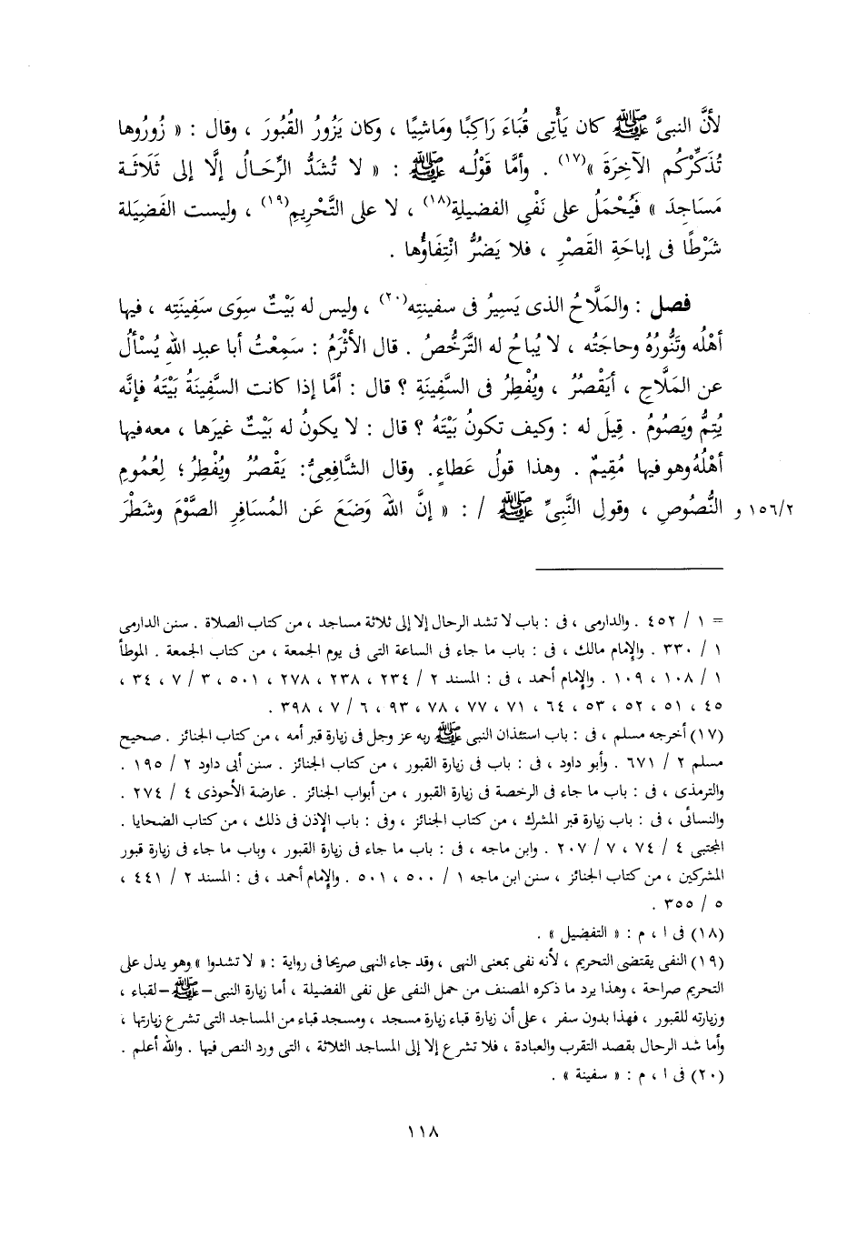 (١٩) النفى يقتضى التحريم، لأنه نفى بمعنى النهى، وقد جاء النهى صريحا في رواية: "لا تشدوا" وهو يدل على التحريم صراحة، وهذا يرد ما ذكره المصنف من حمل النفى على نفى الفضيلة، أما زيارة النبي -صلى اللَّه عليه وسلم- لقباء، وزيارته للقبور، فهذا بدون سفر، على أن زيارة قباء زيارة مسجد، ومسجد قباء من المساجد التي تشرع زيارتها، وأما شد الرحال بقصد التقرب والعبادة، فلا تشرع إلا إلى المساجد الثلاثة، التي ورد النص فيها. واللَّه أعلم.