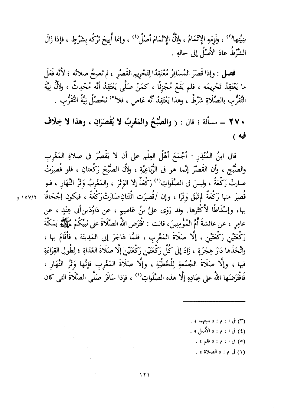 ٢٧٠ - مسألة؛ قال: (والصُّبْحُ والمَغْرِبُ لا يُقْصَرَانِ، وهذا لا خِلَافَ فيه)