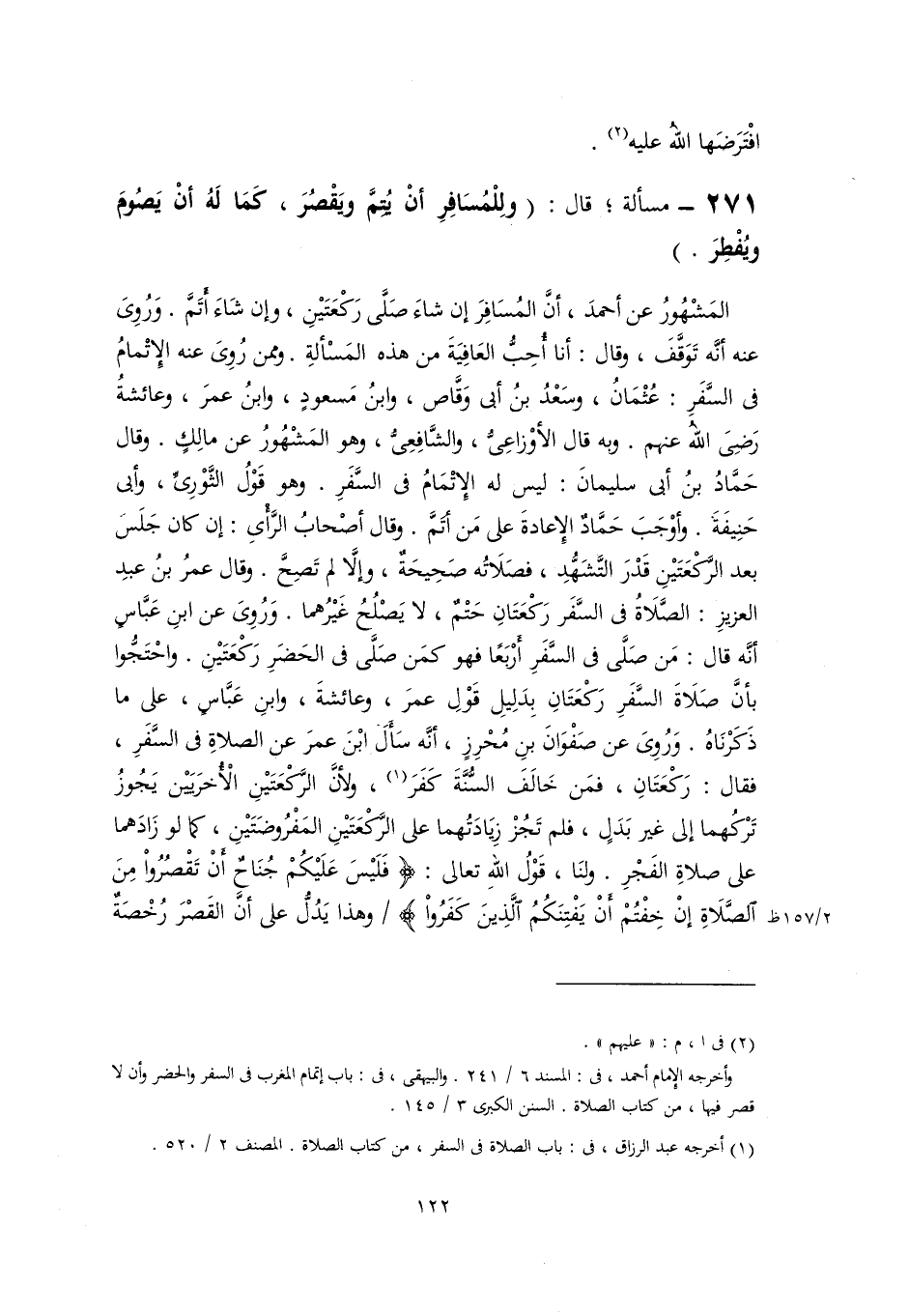 المَشْهُورُ عن أحمدَ، أنَّ المُسَافِرَ إن شاءَ صَلَّى رَكْعَتَيْنِ، وإن شَاءَ أَتَمَّ. وَرُوِىَ عنه أنَّه تَوَقَّفَ، وقال: أنا أُحِبُّ العَافِيَةَ من هذه المَسْألةِ. وممن رُوِىَ عنه الإِتْمامُ في السَّفَرِ: عُثْمَانُ، وسَعْدُ بنُ أبى وَقَّاص، وابنُ مَسعودٍ، وابنُ عمرَ، وعائشةُ رَضِىَ اللهُ عنهم. وبه قال الأوْزاعِىُّ، والشَّافِعِىُّ، وهو المَشْهُورُ عن مالِكٍ. وقال حَمَّادُ بنُ أبى سليمانَ: ليس له الإِتْمَامُ في السَّفَرِ. وهو قَوْلُ الثَّوْرِىِّ، وأبى حَنِيفَةَ. وأوْجَبَ حَمَّادٌ الإِعادةَ على مَن أتَمَّ. وقال أصْحابُ الرَّأْىِ: إن كان جَلَسَ بعد الرَّكْعَتَيْنِ قَدْرَ التَّشَهُّدِ، فصَلَاتُه صَحِيحَةٌ، وإلَّا لم تَصِحَّ. وقال عمرُ بنُ عبدِ العزيزِ: الصَّلَاةُ في السَّفَر رَكْعَتَانِ حَتْمٌ، لا يَصْلُحُ غَيْرُهما. وَرُوِىَ عن ابنِ عَبَّاسٍ أنَّه قال: مَن صَلَّى في السَّفَرِ أَرْبَعًا فهو كمَن صَلَّى في الحَضَرِ رَكْعَتَيْنِ. واحْتَجُّوا بأنَّ صَلَاةَ السَّفَرِ رَكْعَتَانِ بِدَلِيلِ قَوْلِ عمرَ، وعائشةَ، وابنِ عَبَّاسٍ، على ما ذَكَرْنَاهُ. وَرُوِىَ عن صَفْوَانَ بنِ مُحْرِزٍ، أنَّه سَأَلَ ابْنَ عمرَ عن الصلاةِ في السَّفَرِ، فقال: رَكْعَتَانِ، فمَن خَالَفَ السُّنَّةَ كَفَرَ (١)، ولأنَّ الرَّكْعَتَيْنِ الْأُخرَيَيْن يَجُوزُ تَرْكُهما إلى غير بَدَلٍ، فلم تَجُزْ زِيَادَتُهما على الرَّكْعَتَيْنِ المَفْرُوضَتَيْنِ، كما لو زَادَهما على صلاةِ الفَجْرِ. ولنَا، قَوْلُ اللهِ تعالى: {فَلَيْسَ عَلَيْكُمْ جُنَاحٌ أَنْ تَقْصُرُوا مِنَ الصَّلَاةِ إِنْ خِفْتُمْ أَنْ يَفْتِنَكُمُ الَّذِينَ كَفَرُوا} وهذا يَدُلُّ على أنَّ القَصْرَ رُخْصَةٌ