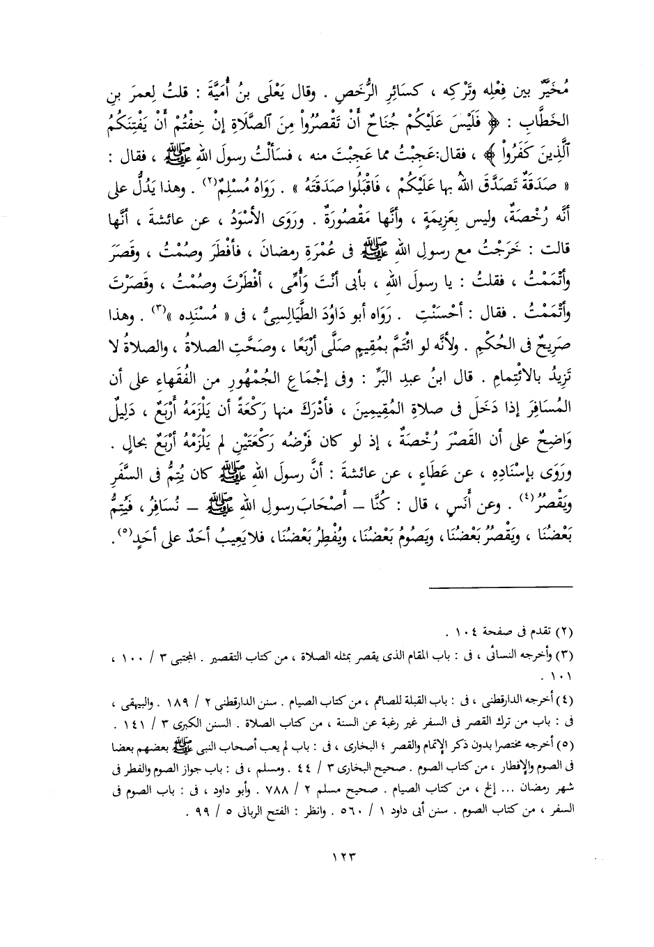 مُخَيَّرٌ بين فِعْلِه وتَرْكِه، كسَائِرِ الرُّخَصِ. وقال يَعْلَى بنُ أُمَيَّةَ: قلتُ لِعمرَ بنِ الخَطَّابِ: {فَلَيْسَ عَلَيْكُمْ جُنَاحٌ أَنْ تَقْصُرُوا مِنَ الصَّلَاةِ إِنْ خِفْتُمْ أَنْ يَفْتِنَكُمُ الَّذِينَ كَفَرُوا}، فقال: عَجِبْتُ مما عَجِبْتَ منه، فسَألْتُ رسولَ اللهِ -صلى اللَّه عليه وسلم-، فقال: "صَدَقَةٌ تَصَدَّقَ اللهُ بها عَلَيْكُمْ، فَاقْبَلُوا صَدَقَتَهُ". رَوَاهُ مُسْلِمٌ (٢). وهذا يَدُلُّ على أنَّه رُخْصَةٌ، وليس بِعَزِيمَةٍ، وأنَّها مَقْصُورَةٌ. ورَوَى الأسْوَدُ، عن عائشةَ، أنَّها قالت: خَرَجْتُ مع رسولِ اللهِ -صلى اللَّه عليه وسلم- في عُمْرَةِ رمضانَ، فأفْطَرَ وصُمْتُ، وقَصَرَ وأتمَمْتُ، فقلتُ: يا رسولَ اللهِ، بأبى أنْتَ وَأُمِّى، أفْطَرْتَ وصُمْتُ، وقَصَرْتَ وأتْمَمْتُ. فقال: أحْسَنْتِ. رَوَاه أبو دَاوُدَ الطَّيَالِسِىُّ، في "مُسْنَدِه" (٣). وهذا صَرِيحٌ في الحُكْمِ. ولأنَّه لو ائْتَمَّ بمُقِيمٍ صَلَّى أرْبَعًا، وصَحَّتِ الصلاةُ، والصلاةُ لا تَزِيدُ بالائْتِمامِ. قال ابنُ عبدِ البَرِّ: وفى إجْمَاعِ الجُمْهُورِ من الفُقَهاءِ على أن المُسَافِرَ إذا دَخَلَ في صلاةِ المُقِيمِينَ، فأدْرَكَ منها رَكْعَةً أن يَلْزَمَهُ أَرْبَعٌ، دَلِيلٌ وَاضِحٌ على أن القَصْرَ رُخْصَةٌ، إذ لو كان فَرْضُه رَكْعَتَيْنِ لم يَلْزَمْهُ أرْبَعٌ بحالٍ. ورَوَى بإسْنَادِهِ، عن عَطَاءٍ، عن عائشةَ: أنَّ رسولَ اللهِ -صلى اللَّه عليه وسلم- كان يُتِمُّ في السَّفَرِ ويَقْصُرُ (٤). وعن أَنَسٍ، قال: كُنَّا - أَصْحَابَ رسولِ اللهِ -صلى اللَّه عليه وسلم- نُسَافِرُ، فَيُتِمُّ بَعْضُنَا، ويَقْصُرُ بَعْضُنَا، ويَصُومُ بَعْضُنَا، ويُفْطِرُ بَعْضُنَا، فلا يَعِيبُ أحَدٌ على أحَدٍ (٥).