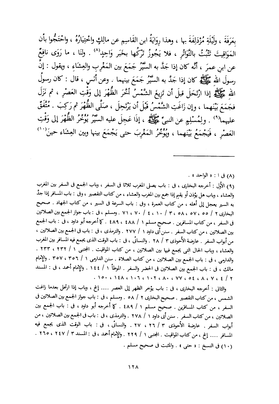 بِعَرَفَةَ، ولَيْلَةِ مُزْدَلِفَةَ بها، وهذا رِوَايَةُ ابن القَاسِمِ عن مالِكٍ واخْتِيَارُهُ، واحْتَجُّوا بأن المَوَاقِيتَ تَثْبُتُ بالتَّوَاتُرِ، فلا يَجُوزُ تَرْكُها بخَبَر وَاحِدٍ (٨). ولنَا، ما رَوَى نافِعٌ عن ابنِ عمرَ، أنَّه كان إذا جَدَّ به السَّيْرُ جَمَعَ بين المَغْرِبِ والعِشَاءِ، ويقول: إنَّ رسولَ اللهِ -صلى اللَّه عليه وسلم- كان إذا جَدَّ به السَّيْرُ جَمَعَ بينهما. وعن أنَسٍ، قال: كان رسولُ اللهِ -صلى اللَّه عليه وسلم- إذا ارْتَحَلَ قبلَ أن تَزِيغَ الشَّمْسُ أخَّرَ الظُّهْرَ إلى وَقْتِ العَصْرِ، ثم نَزَلَ فجَمَعَ بَيْنَهما، وإن زَاغَتِ الشَّمْسُ قَبْلَ أن يَرْتَحِلَ، صَلَّى الظُّهْرَ ثم رَكِبَ. مُتَّفَقٌ عليهما (٩). ولِمُسْلِمٍ عن النبيِّ -صلى اللَّه عليه وسلم-، إذَا عَجِلَ عليه السَّيْرُ يُؤَخِّرُ الظُّهْرَ إلى وَقْتِ العَصْرِ، فَيَجْمَعُ بَيْنَهما، ويُؤَخِّرُ المَغْرِبَ حتى يَجْمَعَ بينها وبين العِشَاء حينَ (١٠)