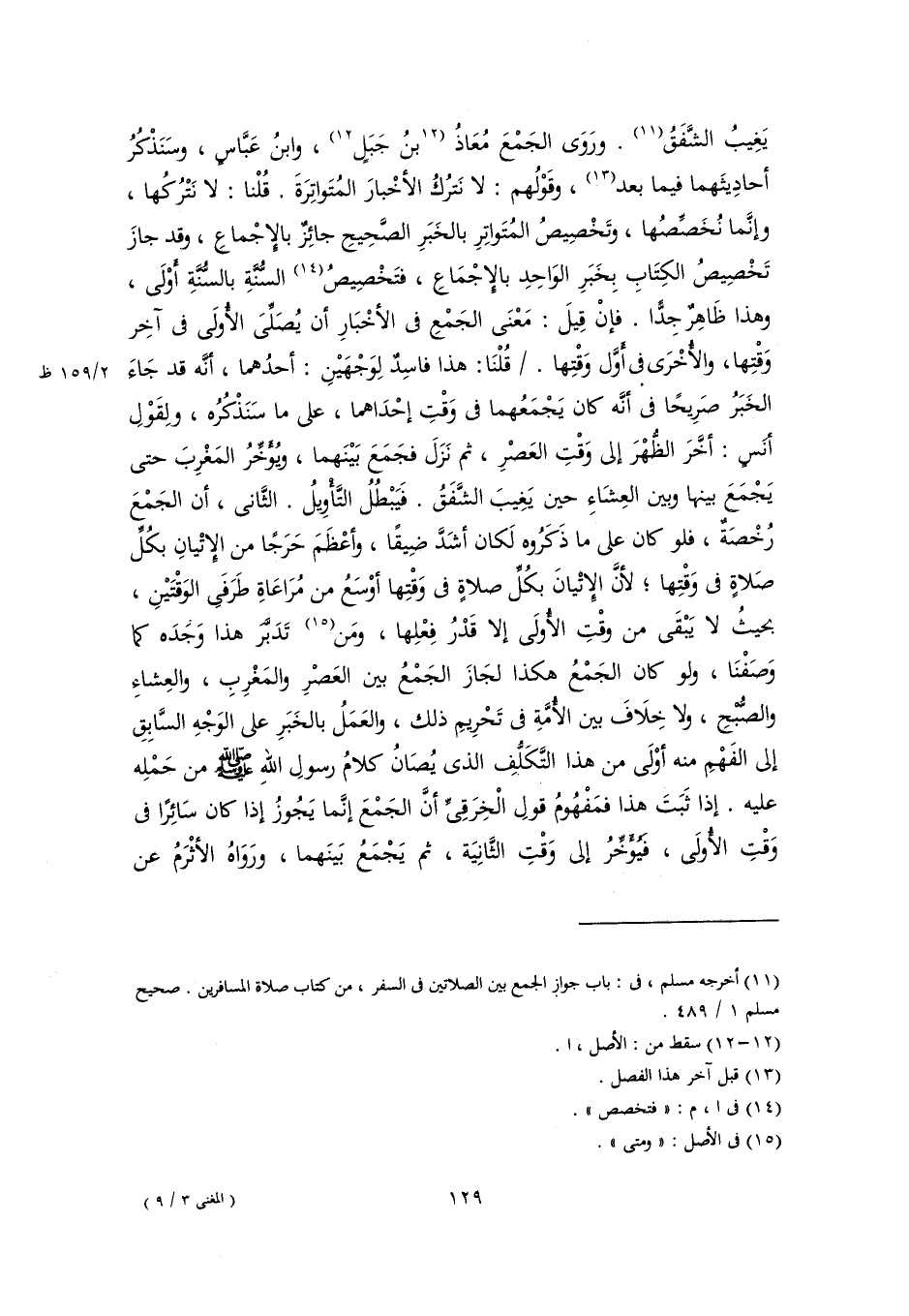 يَغِيبُ الشَّفَقُ (١١). ورَوَى الجَمْعَ مُعَاذُ [بنُ جَبَلٍ] (١٢)، وابنُ عَبَّاسٍ، وسَنَذْكُرُ أحادِيثَهما فيما بعد (١٣)، وقَوْلُهم: لا نَترُكُ الأخْبارَ المُتَواتِرَةَ. قُلْنا: لا نَتْرُكُها، وإنَّما نُخَصِّصُها، وتَخْصِيصُ المُتَواتِرِ بالخَبَرِ الصَّحِيحِ جائِزٌ بالإِجْماعِ، وقد جازَ تَخْصِيصُ الكِتَابِ بِخَبَرِ الوَاحِدِ بالإِجْمَاعِ، فتَخْصِيصُ (١٤) السُّنَّةِ بالسُّنَّةِ أَوْلَى، وهذا ظَاهِرٌ جِدًّا. فإنْ قِيلَ: مَعْنَى الجَمْعِ في الأخْبَارِ أن يُصَلِّىَ الأُولَى في آخِر وَقْتِها، والأُخْرَى في أَوَّل وَقْتِها. قُلْنَا: هذا فاسِدٌ لِوَجْهَيْنِ: أحدُهما، أنَّه قد جَاءَ الخَبَرُ صَرِيحًا في أنَّه كان يَجْمَعُهما في وَقْتِ إحْدَاهما، على ما سَنَذْكُرُه، ولِقَوْلِ أنَسٍ: أخَّرَ الظُّهْرَ إلى وَقتِ العَصْرِ، ثم نَزَل فجَمَعَ بَيْنَهما، ويُؤَخِّرُ المَغْرِبَ حتى يَجْمَعَ بينها وبين العِشَاءِ حين يَغِيبَ الشَّفَقُ. فَيَبْطُلُ التَّأْوِيلُ. الثَّانى، أن الجَمْعَ رُخْصَةٌ، فلو كان على ما ذَكَرُوه لَكان أشَدَّ ضِيقًا، وأعْظَمَ حَرَجًا من الإِتْيانِ بكُلِّ صَلاةٍ في وَقْتِها؛ لأنَّ الإِتْيانَ بكُلِّ صلاةٍ في وَقْتِها أوْسَعُ من مُرَاعَاةِ طَرَفَىِ الوَقْتَيْنِ، بحيثُ لا يَبْقَى من وقْتِ الأُولَى إلا قَدْرُ فِعْلِها، ومَن (١٥) تَدَبَّرَ هذا وَجَدَه كما وَصَفْنَا، ولو كان الجَمْعُ هكذا لجَازَ الجَمْعُ بين العَصْرِ والمَغْرِبِ، والعِشاءِ والصُّبْحِ، ولا خِلَافَ بين الأُمَّةِ في تَحْرِيمِ ذلك، والعَمَلُ بالخَبَرِ على الوَجْهِ السَّابِقِ إلى الفَهْمِ منه أوْلَى من هذا التَّكَلُّفِ الذي يُصَانُ كلامُ رسولِ اللهِ -صلى اللَّه عليه وسلم- من حَمْلِه عليه. إذا ثَبَتَ هذا فمَفْهُومُ قولِ الْخِرَقِىِّ أنَّ الجَمْعَ إنَّما يَجُوزُ إذا كان سَائِرًا في وَقْتِ الأُولَى، فَيُؤَخِّرُ إلى وَقْتِ الثَّانِيَة، ثم يَجْمَعُ بَينَهما، ورَوَاهُ الأثْرَمُ عن
