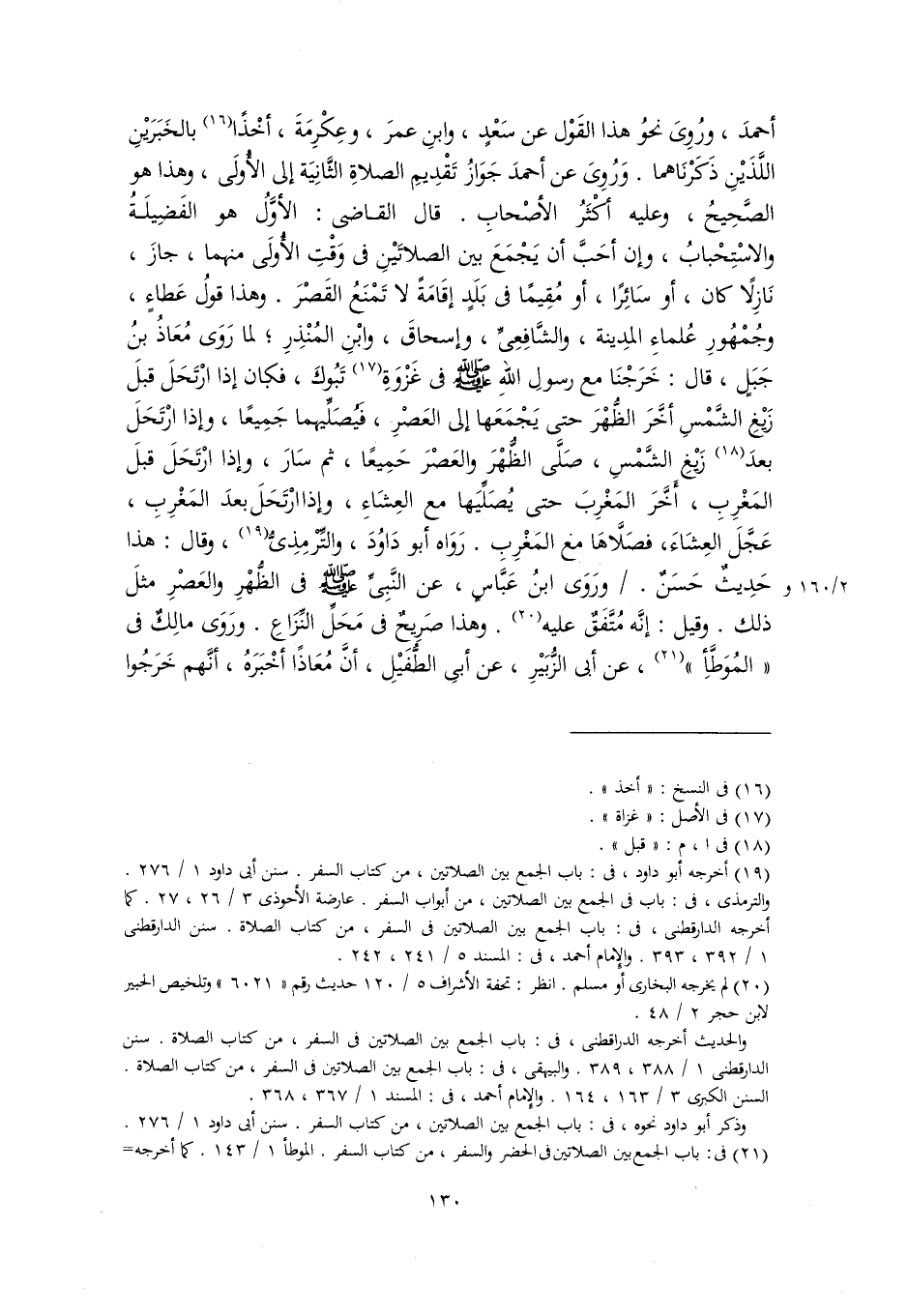(١٩) أخرجه أبو داود، في: باب الجمع بين الصلاتين، من كتاب السفر. سنن أبي داود ١/ ٢٧٦. والترمذي، في: باب في الجمع بين الصلاتين، من أبواب السفر. عارضة الأحوذى ٣/ ٢٦، ٢٧. كما أخرجه الدارقطني، في: باب الجمع بين الصلاتين في السفر، من كتاب الصلاة. سنن الدارقطني ١/ ٣٩٢، ٣٩٣. والإِمام أحمد، في: المسند ٥/ ٢٤١، ٢٤٢.
