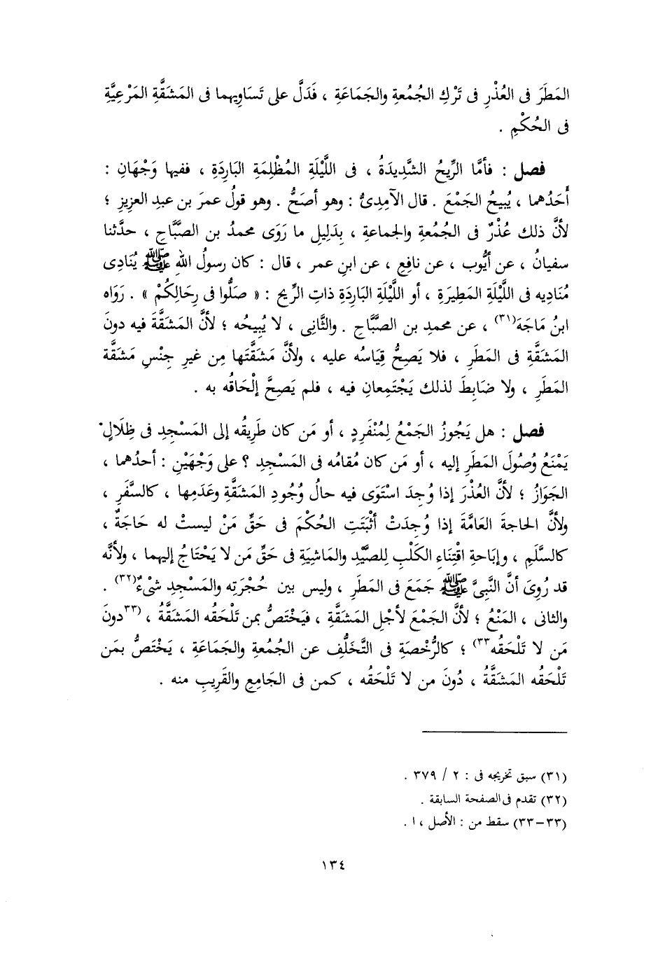 فصل: فأمَّا الرِّيحُ الشَّدِيدَةُ، في اللَّيْلَةِ المُظْلِمَةِ البَارِدَةِ، ففيها وَجْهَانِ: أَحَدُهما، يُبيحُ الجَمْعَ. قال الآمِدِىُّ: وهو أصَحُّ. وهو قولُ عمرَ بن عبدِ العزِيزِ؛ لأنَّ ذلك عُذْرٌ في الجُمُعةِ والجماعةِ، بِدَلِيلِ ما رَوَى محمدُ بن الصَّبَّاحِ، حدَّثنا سفيانُ، عن أيُّوب، عن نافِعِ، عن ابنِ عمر، قال: كان رسولُ اللهِ -صلى اللَّه عليه وسلم- يُنَادِى مُنَادِيه في اللَّيْلَةِ المَطِيرَةِ، أو اللَّيْلَةِ البَارِدَةِ ذاتِ الرِّيح: "صَلُّوا في رِحَالِكُمْ". رَوَاه ابنُ مَاجَهَ (٣١)، عن محمدِ بن الصَّبَّاحِ. والثَّانِى، لا يُبِيحُه؛ لأنَّ المَشَقَّةَ فيه دونَ المَشَقَّةِ في المَطَرِ، فلا يَصِحُّ قِيَاسُه عليه، ولأنَّ مَشَقَّتَها مِن غيرِ جِنْسِ مَشَقَّة المَطرِ، ولا ضَابِطَ لذلك يَجْتَمِعانِ فيه، فلم يَصِحَّ إلْحَاقُه به.